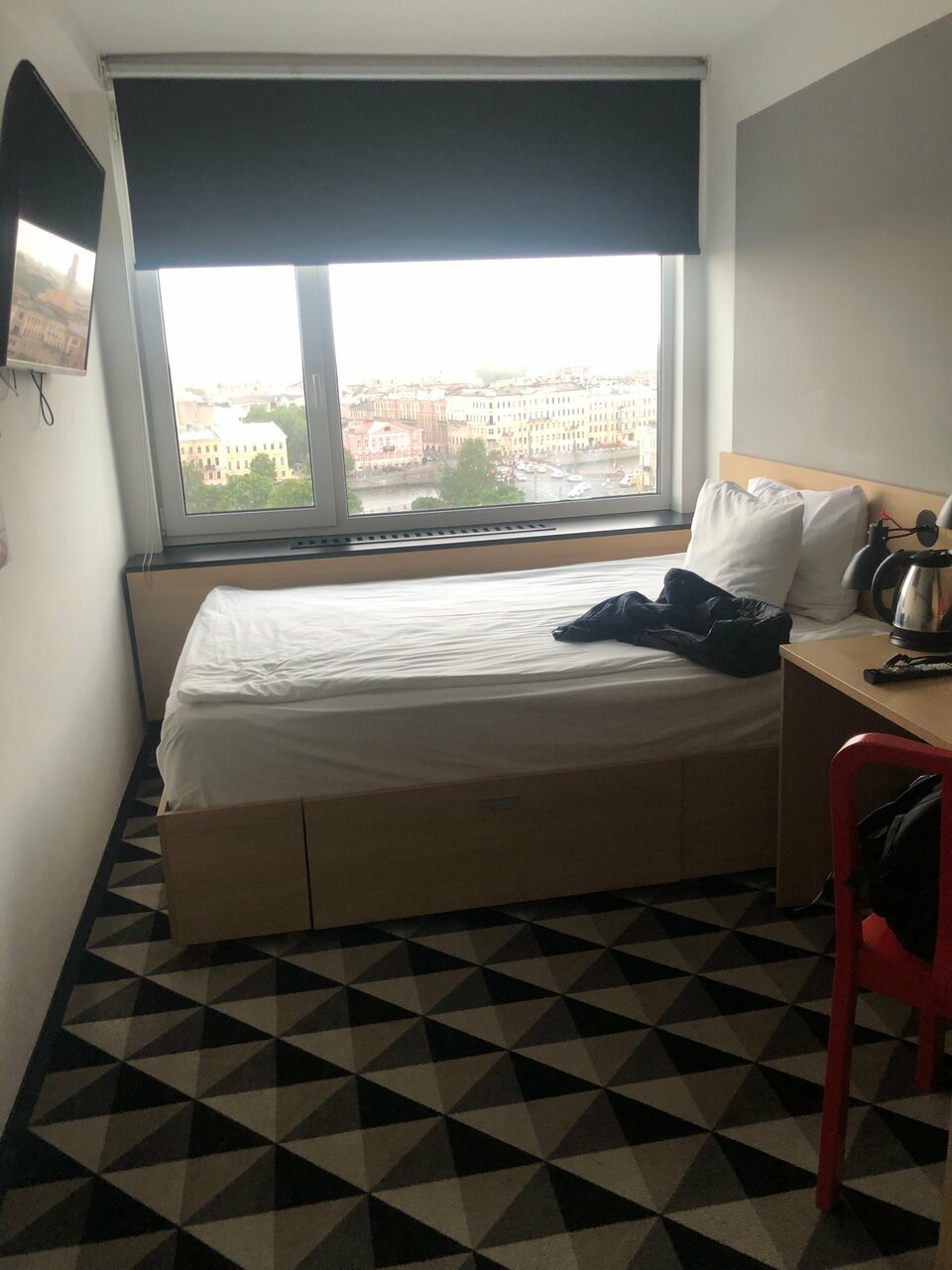 Приезжали в Питер на встречу с друзьями. Места бронировали заранее, однако по приезду вместо двухместного номера нам выделили одноместный. После разбирательства поселили в двухместном номере. Номер и вид из окна хороший. Однако было не понятно где из двух мест завтракать. Завтракали в столовой которую указали при въезде. Уборка проводилась качественно, но очень растраивала работа лифтов.