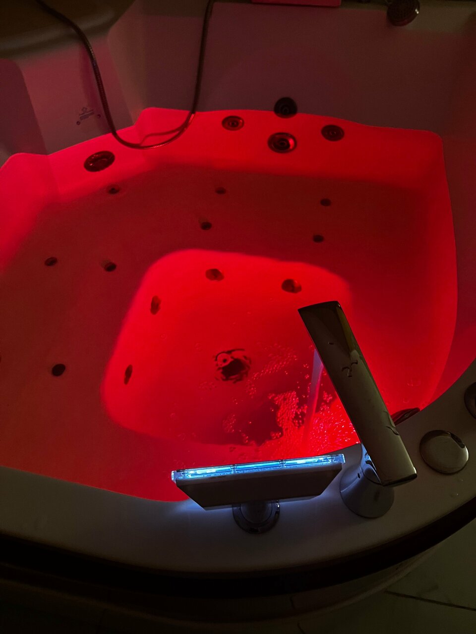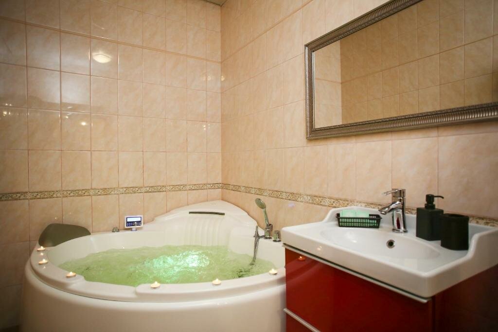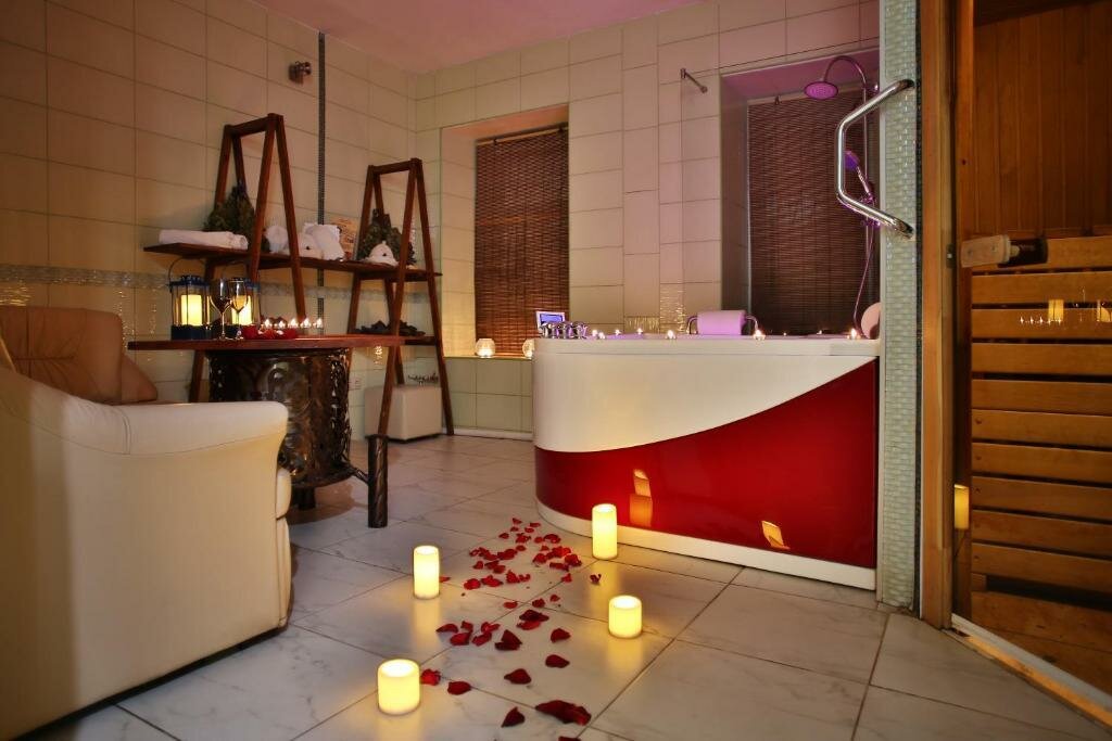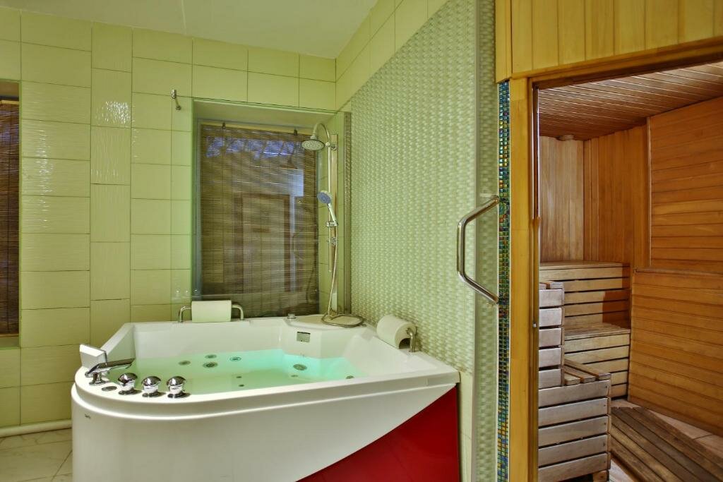 Отель по домашнему на первом этаже, с удобно расположенным спа комплексом в номере. Сауна и джакузи + я бы к ним пошел массажистом.