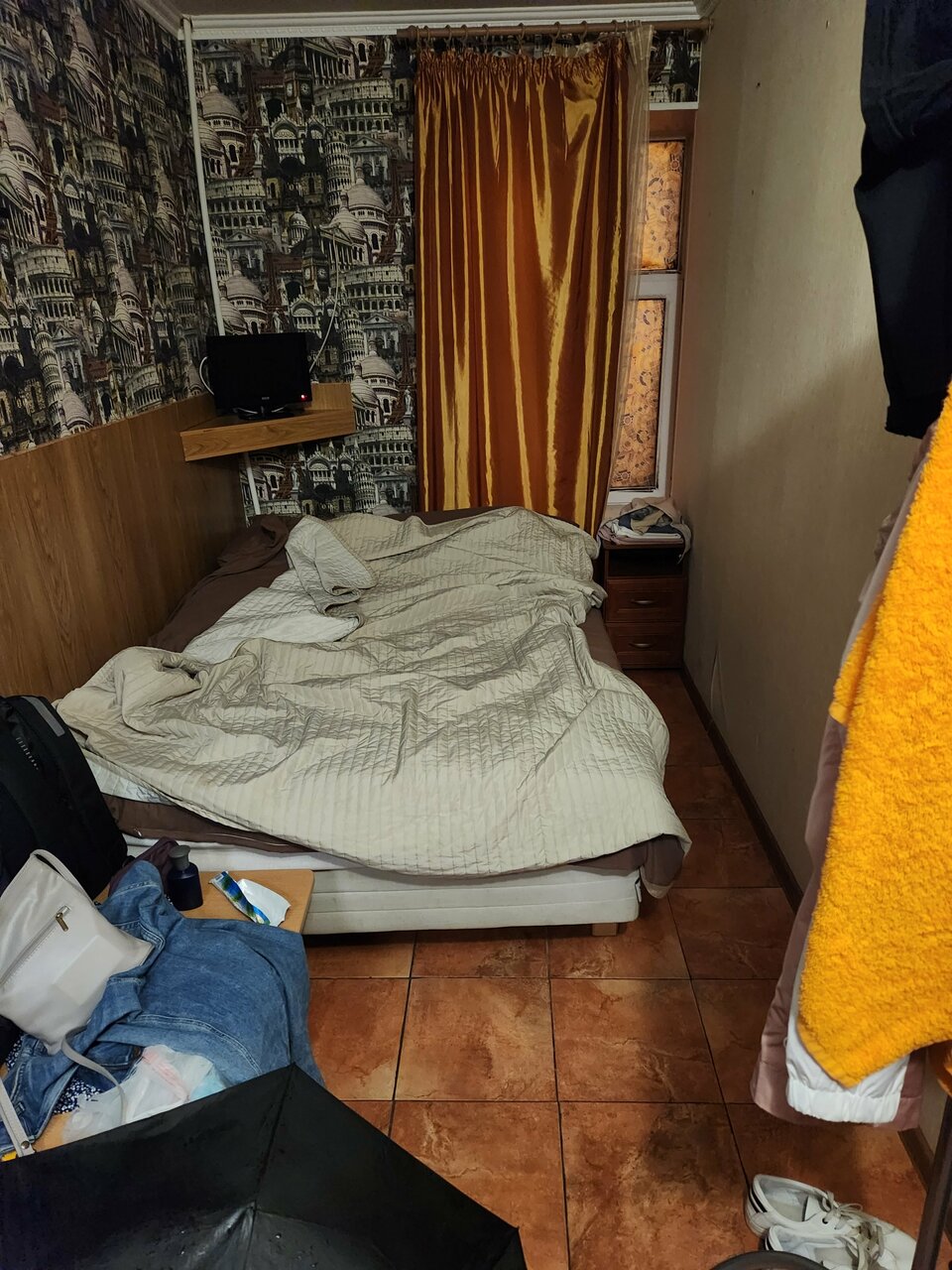 Отель ужасный, фото не соответствуют действительности. В ванной комнате поддон покрыт ржавчиной, душ течет со всех сторон, вода не уходит! В комнате матрац на кровати, на котором невозможно спать, по тому что пружины выпирают по всей кровати, простынь постоянно собирается, грязь везде, под кроватью что только не валяется, даже контейнеры. Пульт от телевизора перемотан скотчем! Окно видно никогда не мыли!