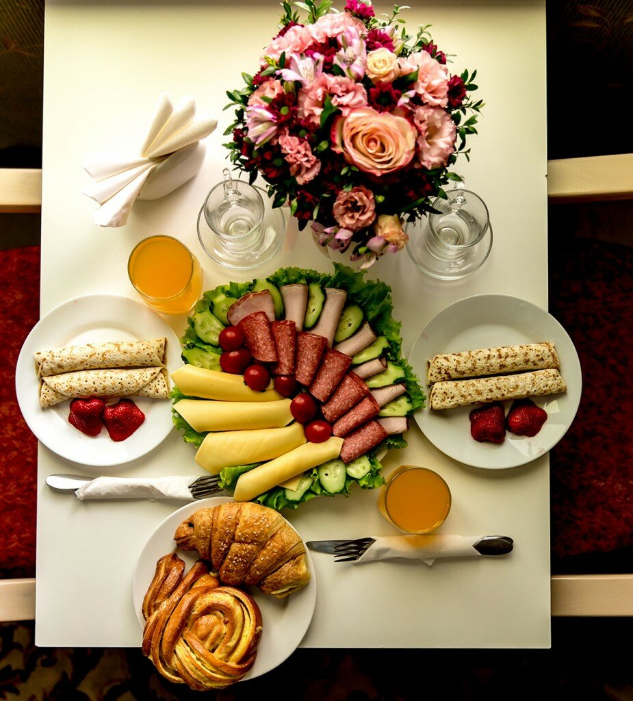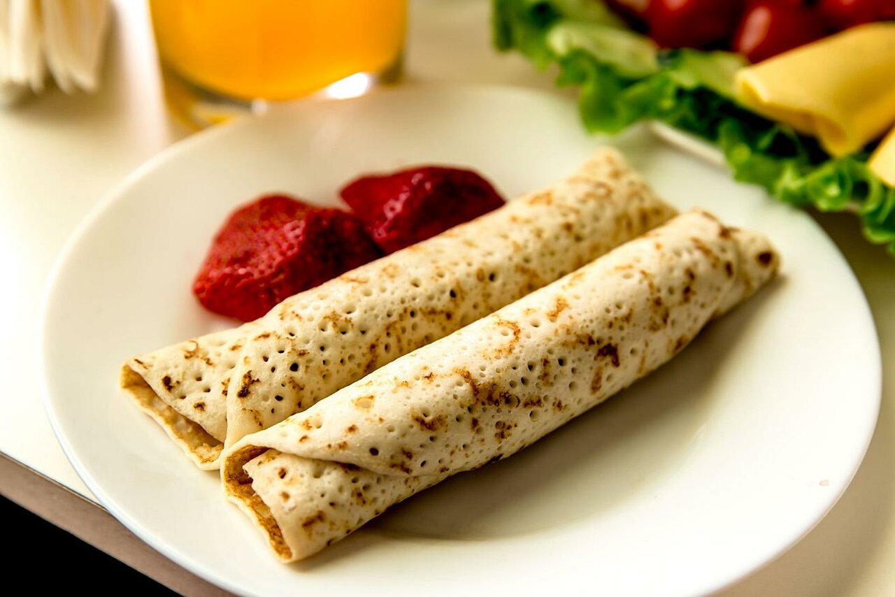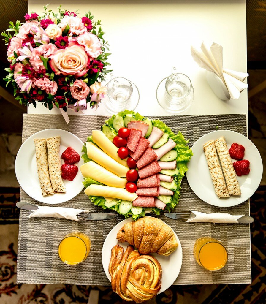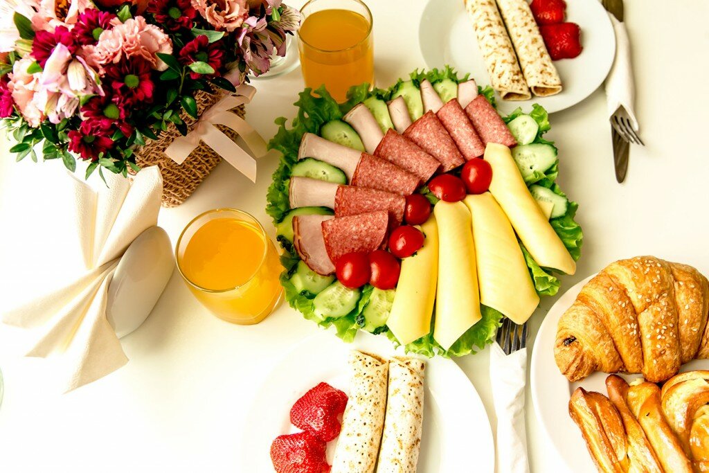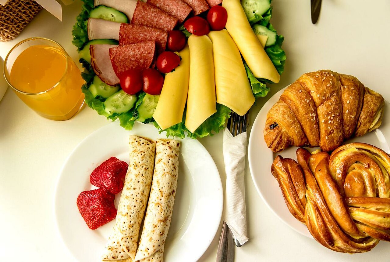 - Вкусные завтраки (блины, запеченное филе цыплёнка).