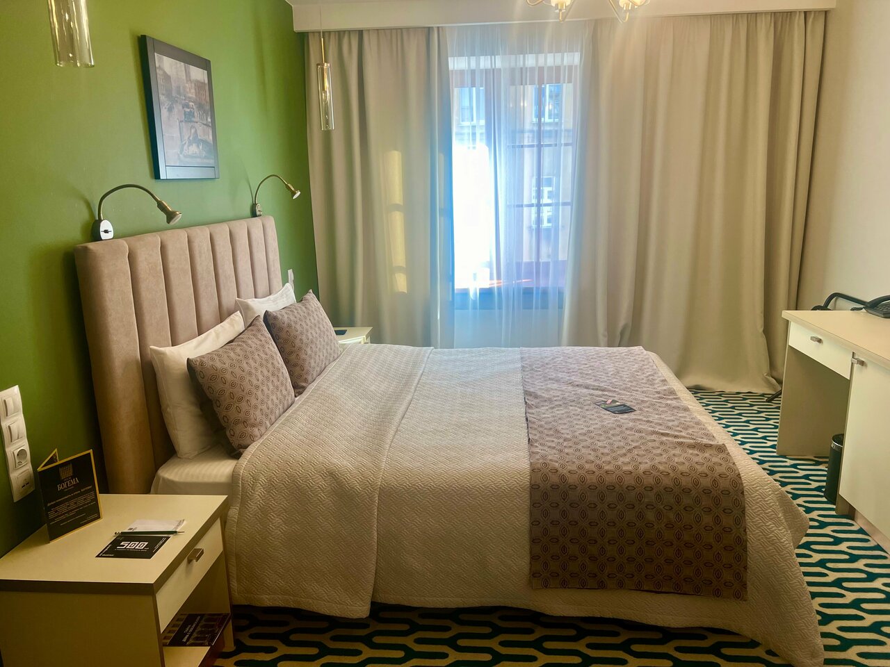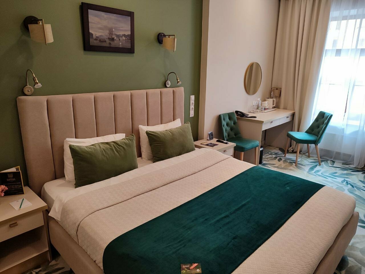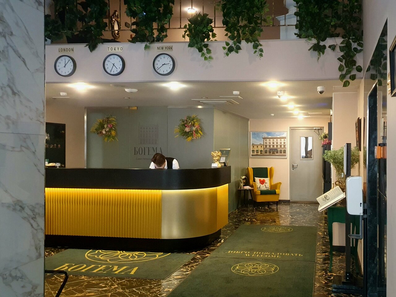 Отель Богема — это просто сказка! Месторасположение отеля -Мучной переулок — это центр Питера! Сотрудники на ресепшн очень приветливые, доброжелательные и отзывчивые. В номере есть всё для проживания: халаты, тапочки, туалетные принадлежности, полотенце, белоснежное бельё, чай, кофе и пр. Все достопримечательности культурной столицы в шаговой доступности! Метро пользовались только, чтобы посетить Диво остров и Гранд макет. Обязательно посетите ресторан при отеле. Это поистине — райский уголок. Бизнес-ланч не хуже отличного обеда в лучших ресторанах города. Очень вкусно! Пожалели, что посетили ресторан только в последний день! Кстати, при заезде дали фишки на бокал игристого вина. Если поедем в Питер, то непременно, будем останавливаться только в этом отеле!