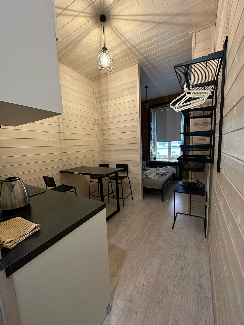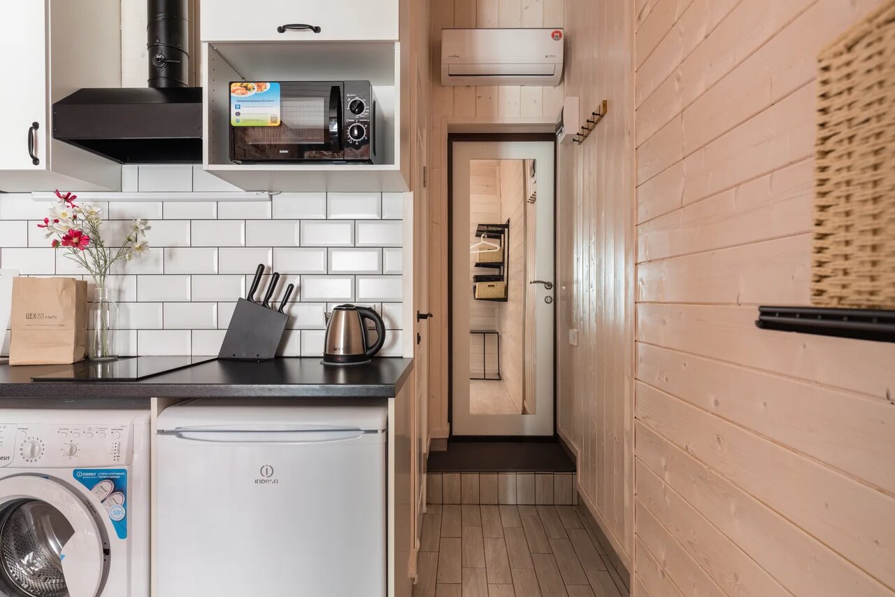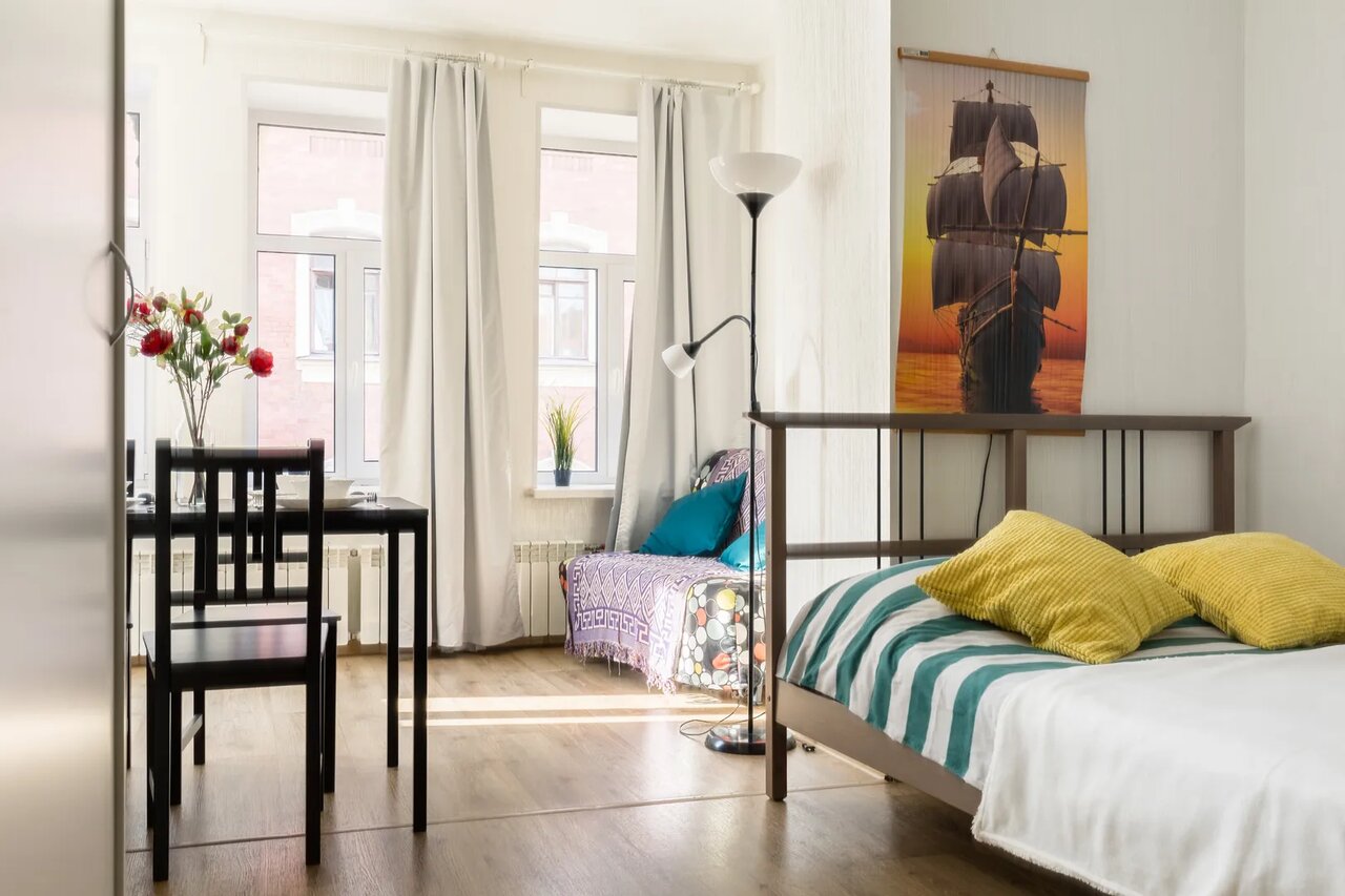 Атмосферная студия с большими окнами с комфортом разместит двух человек, для третьего гостя мы предоставим евро-раскладушку Икеа. Удобство и функциональность внутреннего устройства гарантирует Вам полноценный отдых.