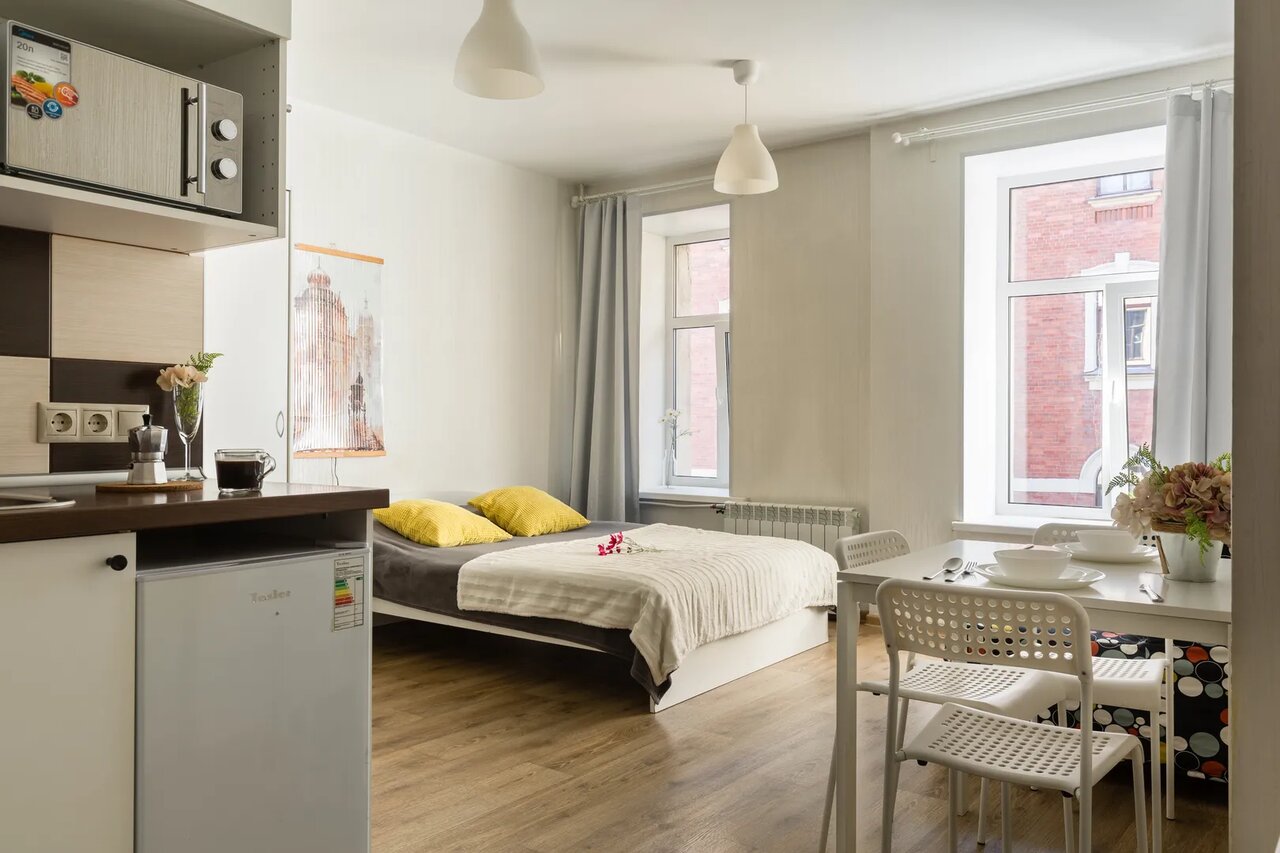Студия вообще не та что на фото. Унылая , темная с одним окном , как выразился менеджер , дают то, что свободно На протяжении проживания в квартире жутко воняло канализацией , и ничто этот запах не перебивало. В общем впечатления такие себе