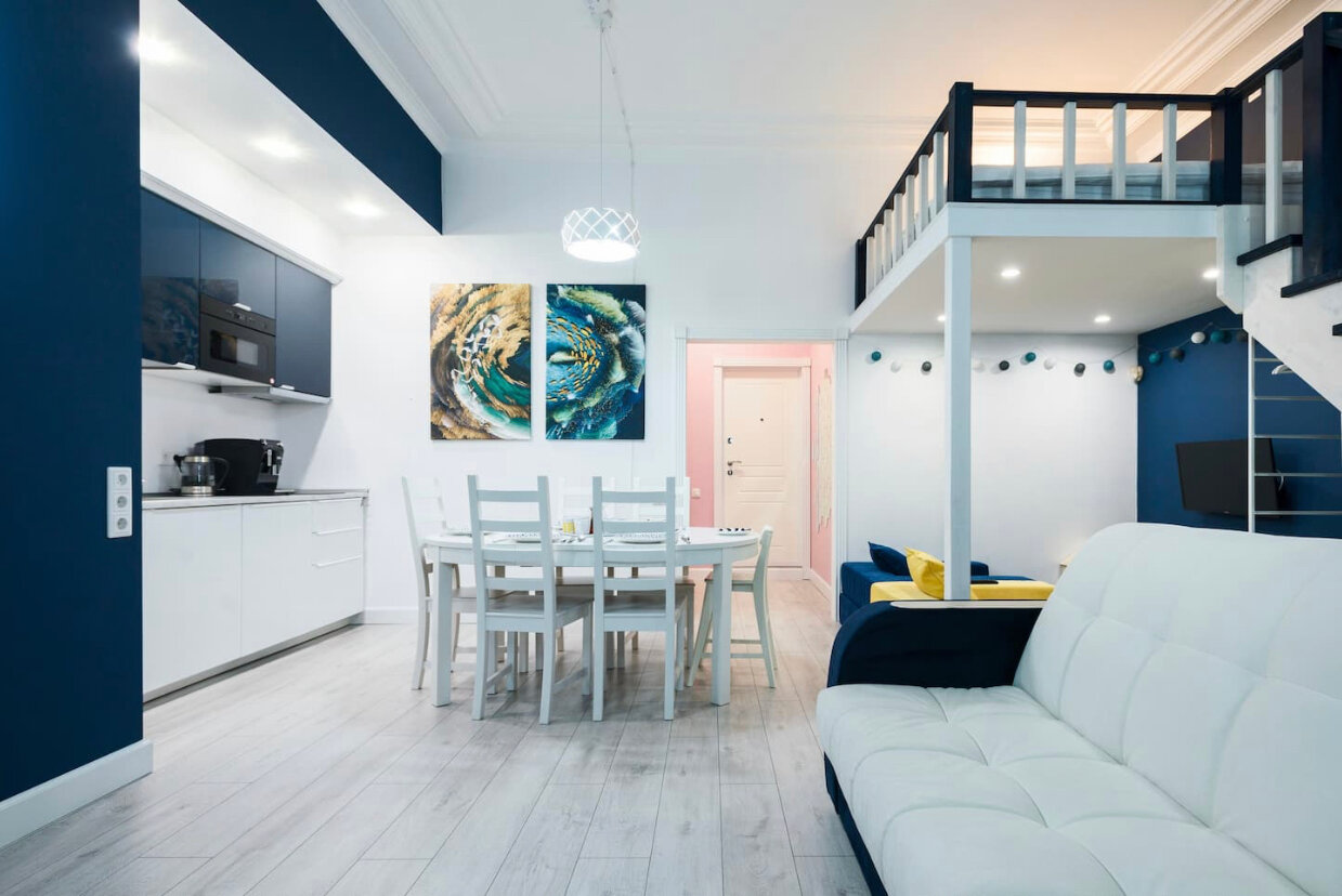 Яркие двухуровневые апартаменты со всеми удобствами в самом центре Санкт-Петербурга, всего в 10 минутах ходьбы от Московского вокзала и через дорогу от метро.