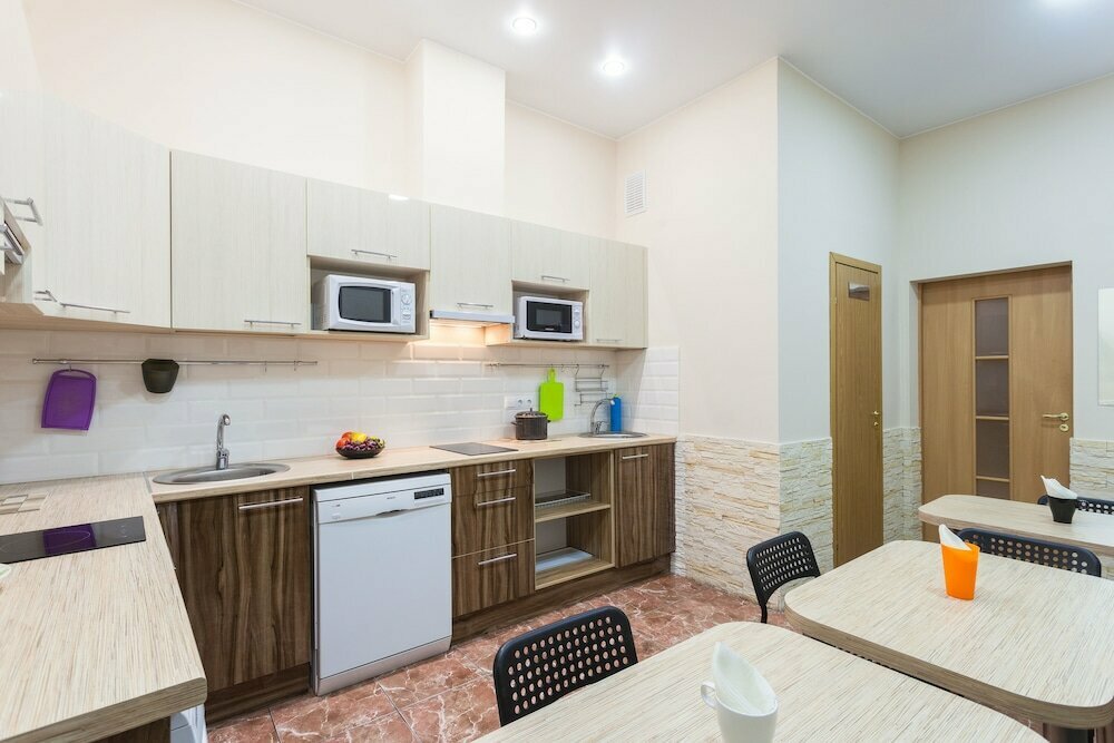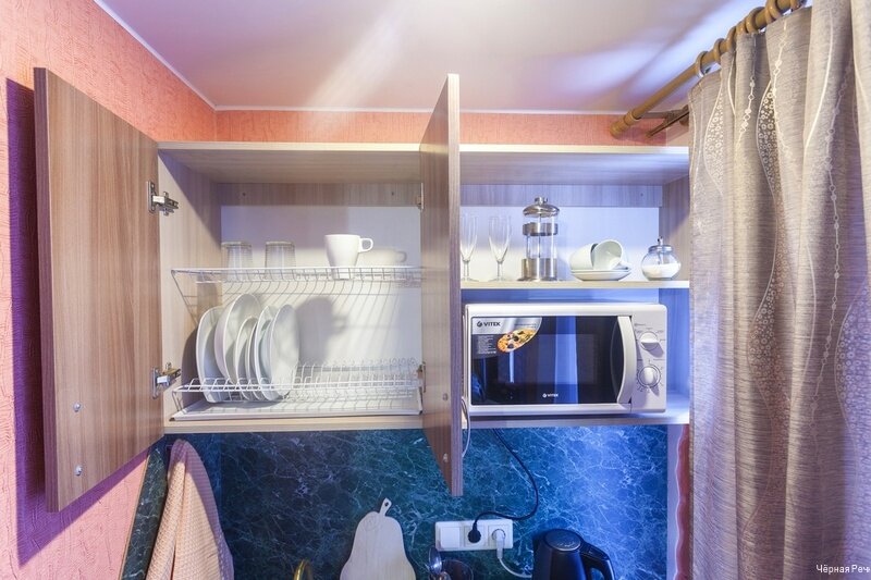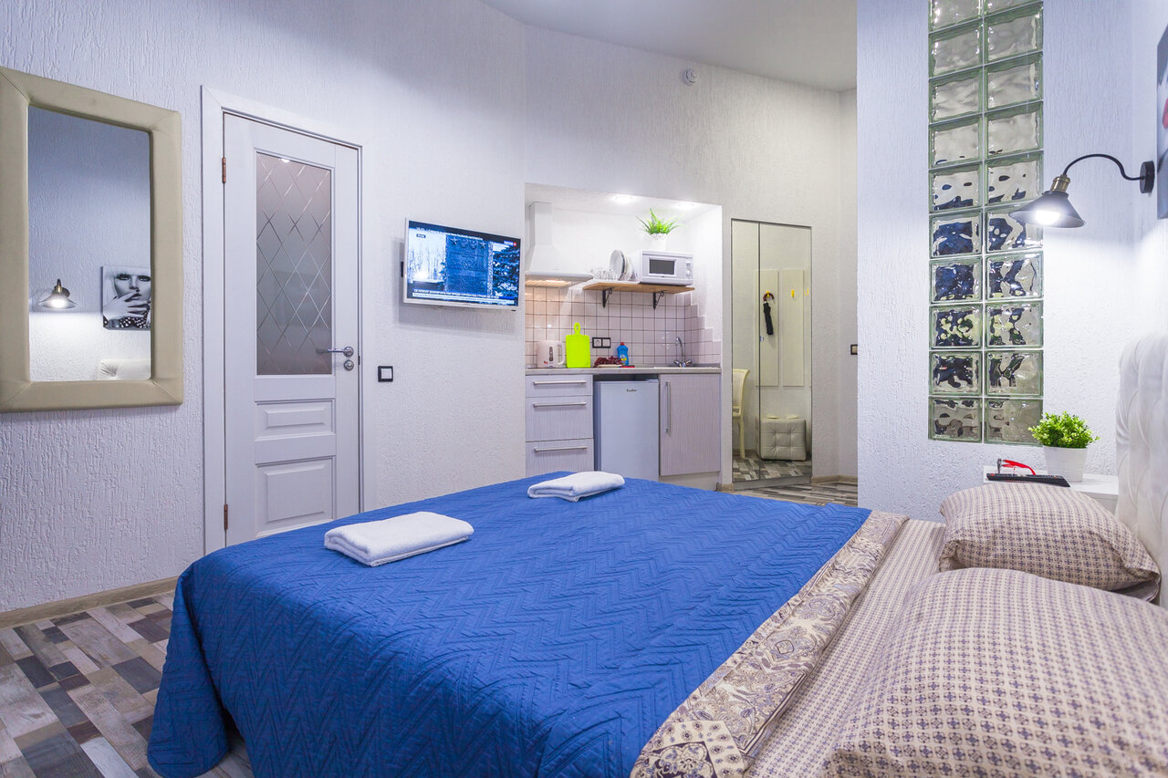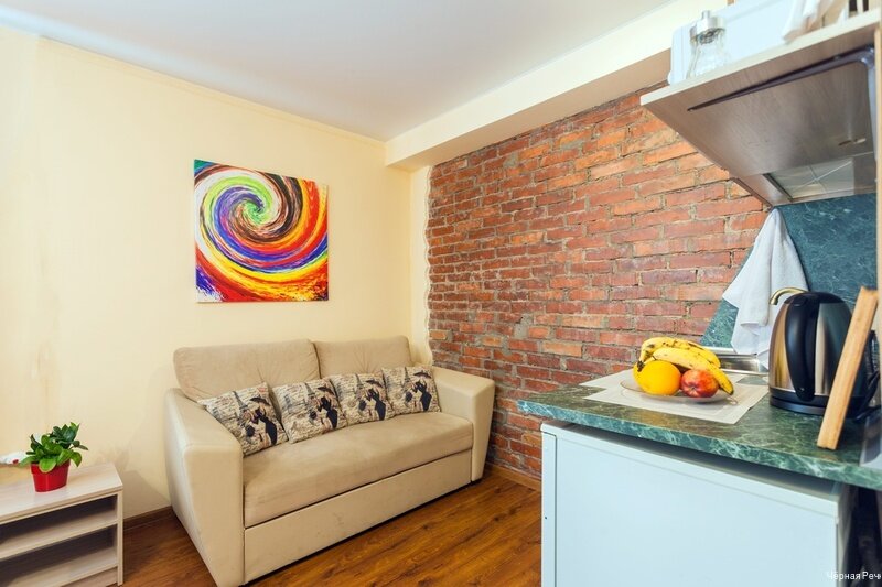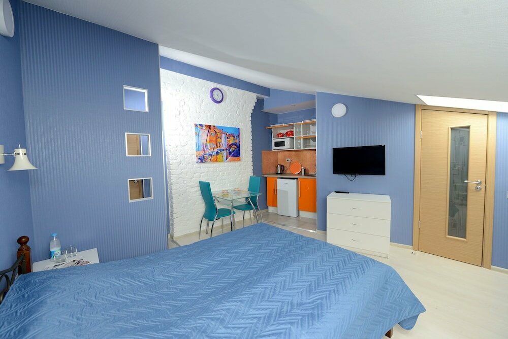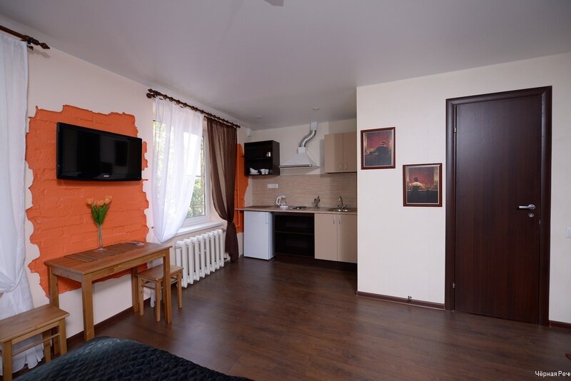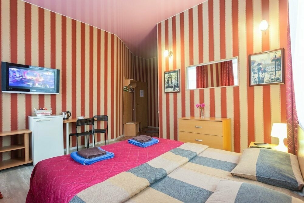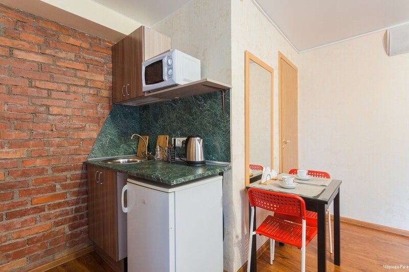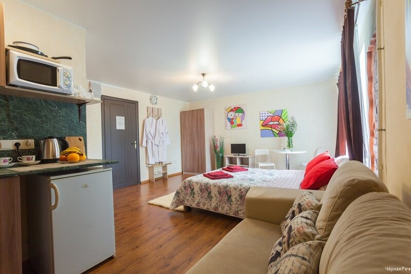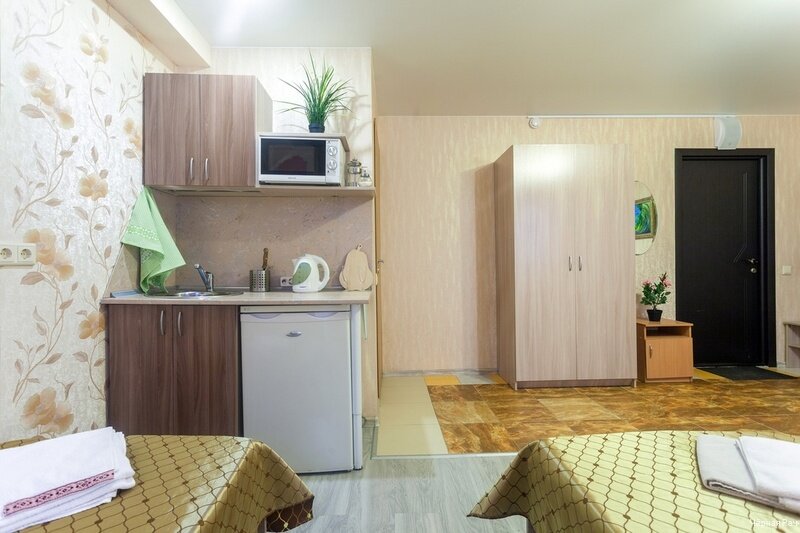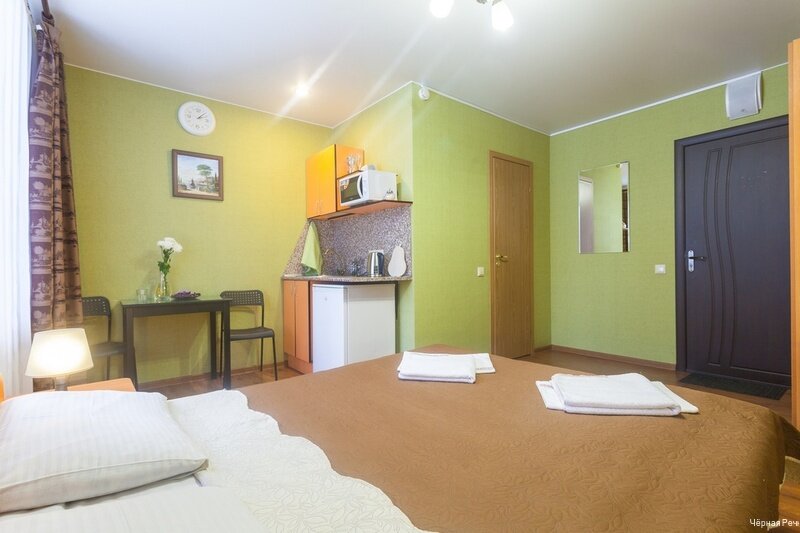 Предлагает недорогие номера (от 1500 ₽/ночь) с удобствами: санузел, Wi-Fi, телевизор, холодильник, чай/кофе, фен, сейф. В апартотелях есть кухонные уголки или общая кухня (микроволновка, посудомойка, стиральная машина).