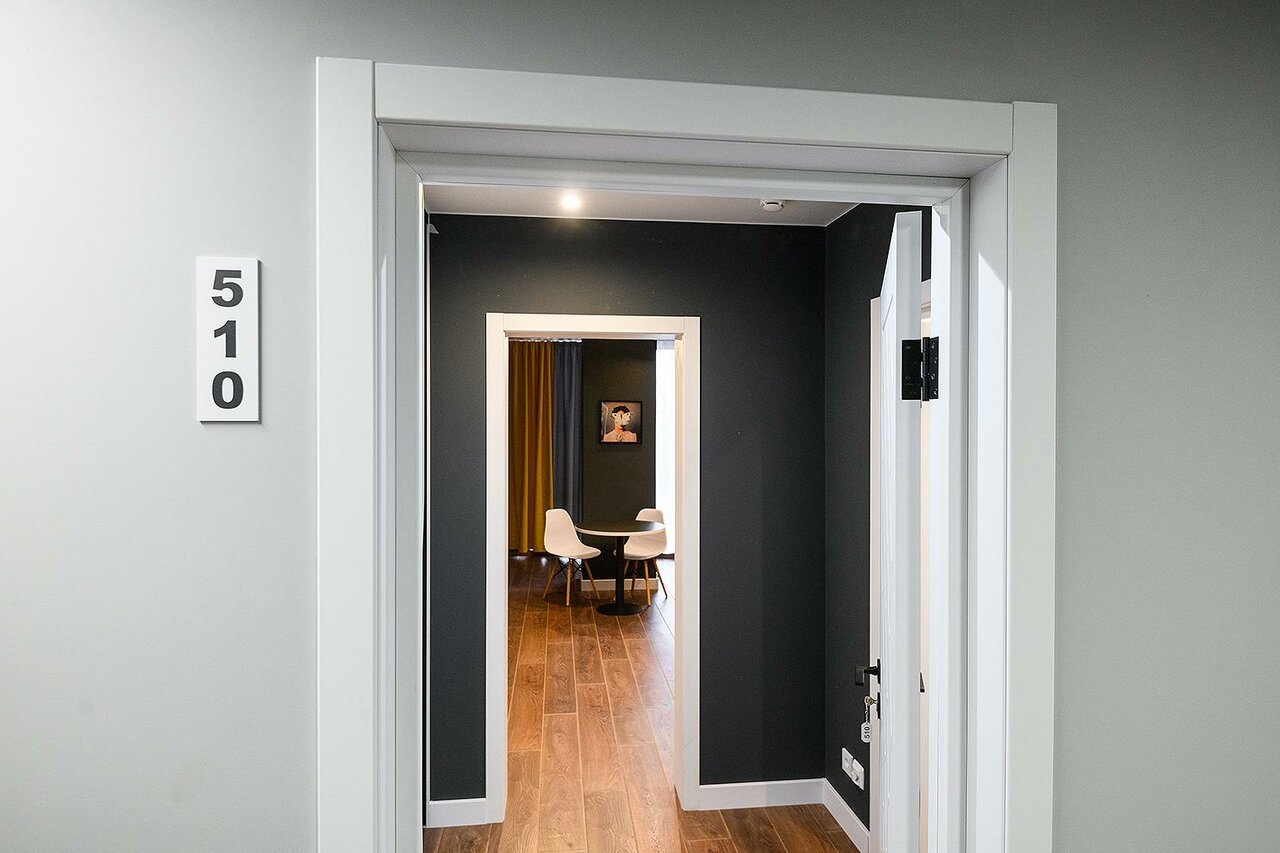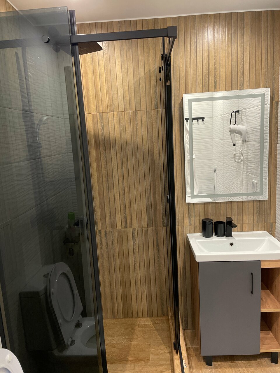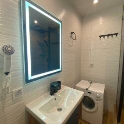 Хорошая новая гостиница на пятом этаже жилого дома. Вход по ключу. Лифт не переполнен. Стойка ресепшен круглосуточная. Кулер для воды в коридоре. В номере холодильник, кухня с посудомойкой, кондиционер, телевизор. В номере тихо. Как только похолодало включили отопление. Уборка каждый день со сменой полотенец.