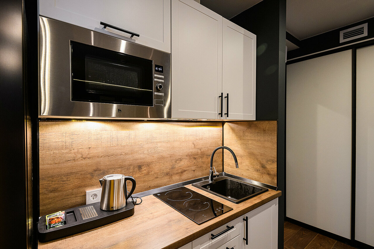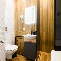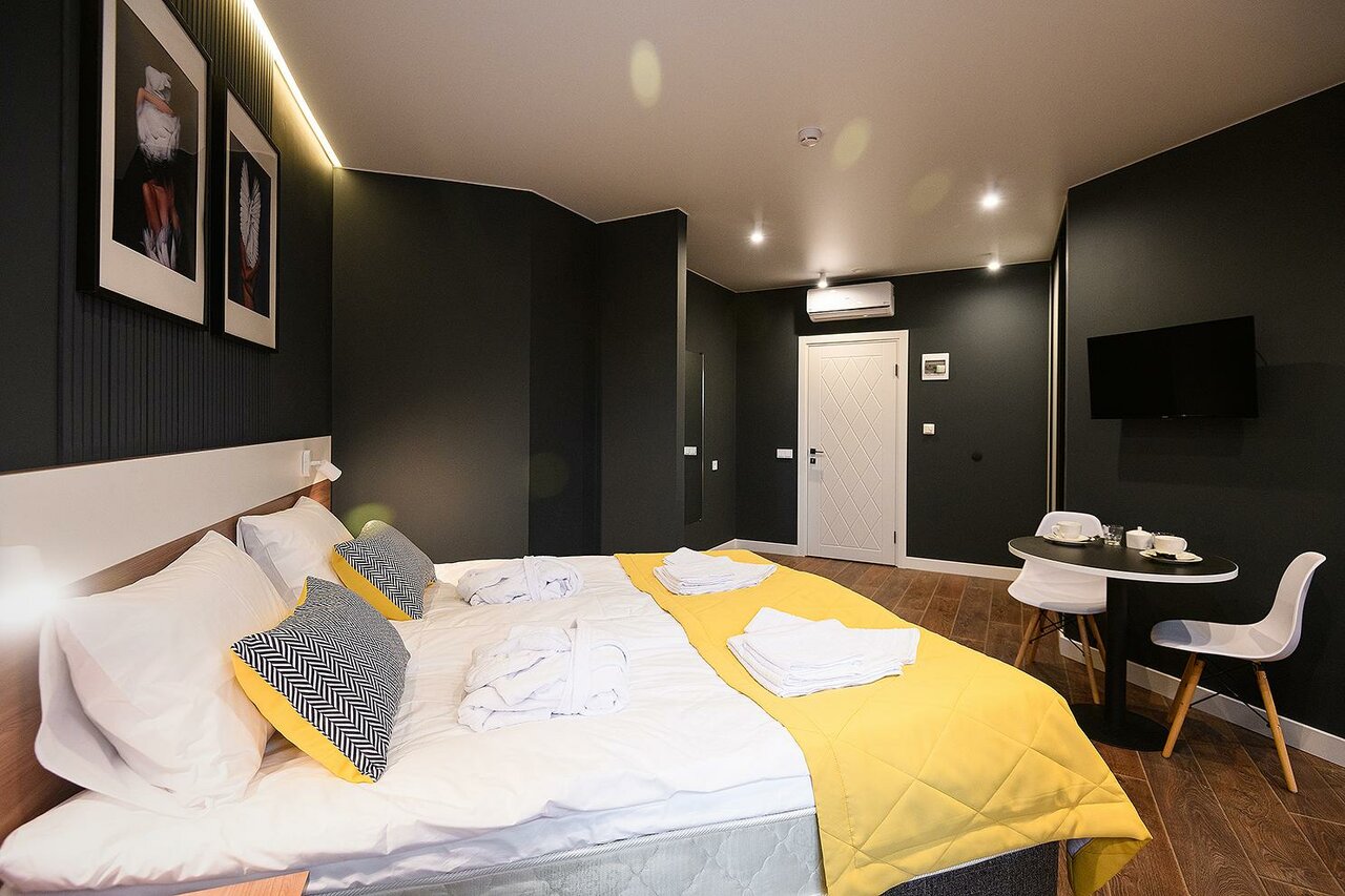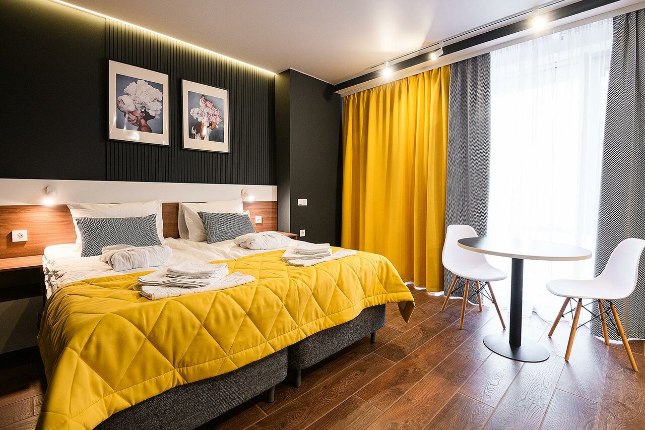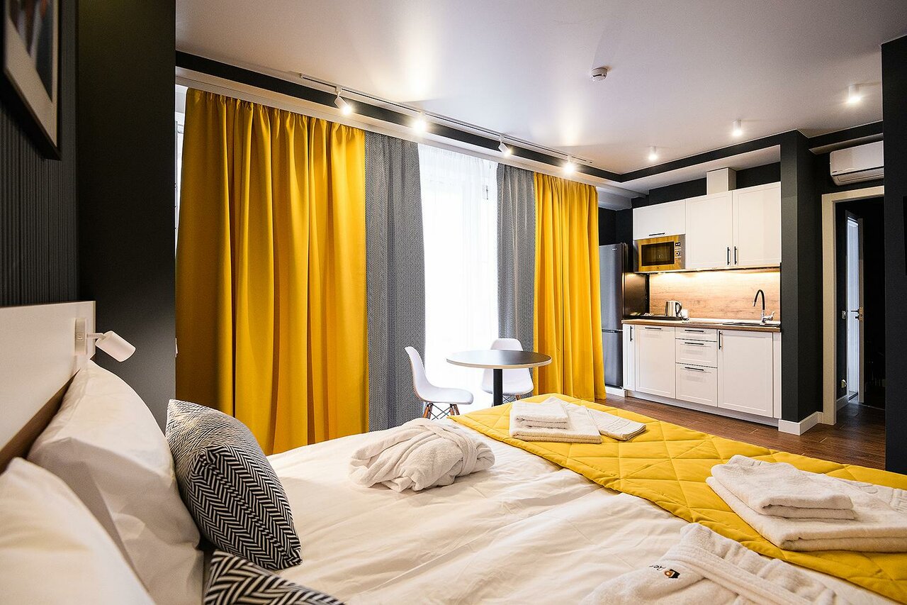 Удобства: — Номера со звукоизоляцией, кондиционером, Wi-Fi, телевизором, холодильником, чайником, микроволновкой, посудой и кухонной зоной. — Дополнительно: фен, халаты, тапочки, сейф, стиральная машина, утюг, тренажёрный зал. — Доступны номера с кроватью king-size, общим туалетом и пандусом для маломобильных гостей.