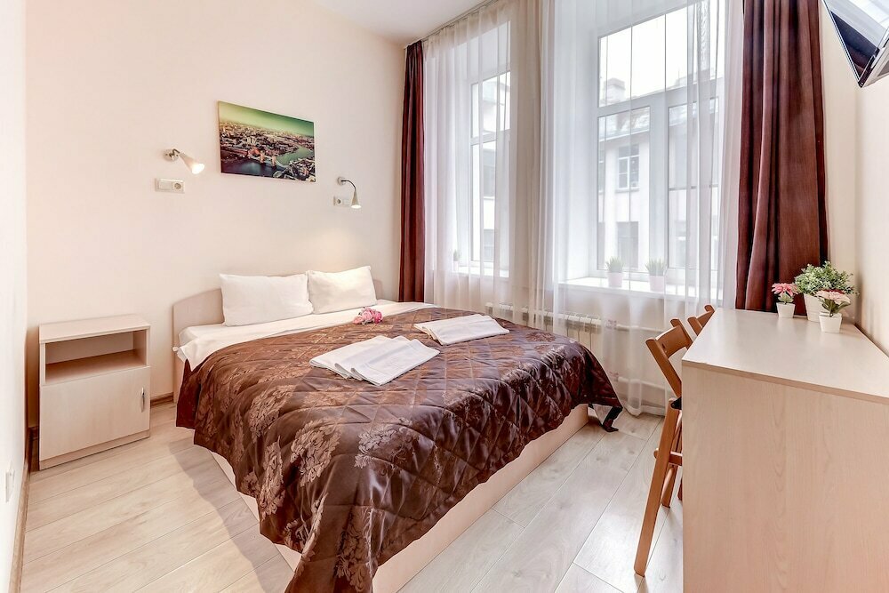 Расположена в центре Санкт-Петербурга, на Невском проспекте, 95. Мини-отель предлагает комфортные номера (от 1800 до 3000 ₽/ночь) с Wi-Fi, телевизором, холодильником и санузлом. В некоторых номерах есть кухонный уголок или общая кухня.