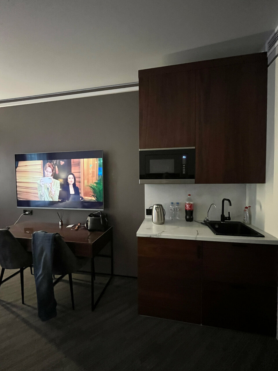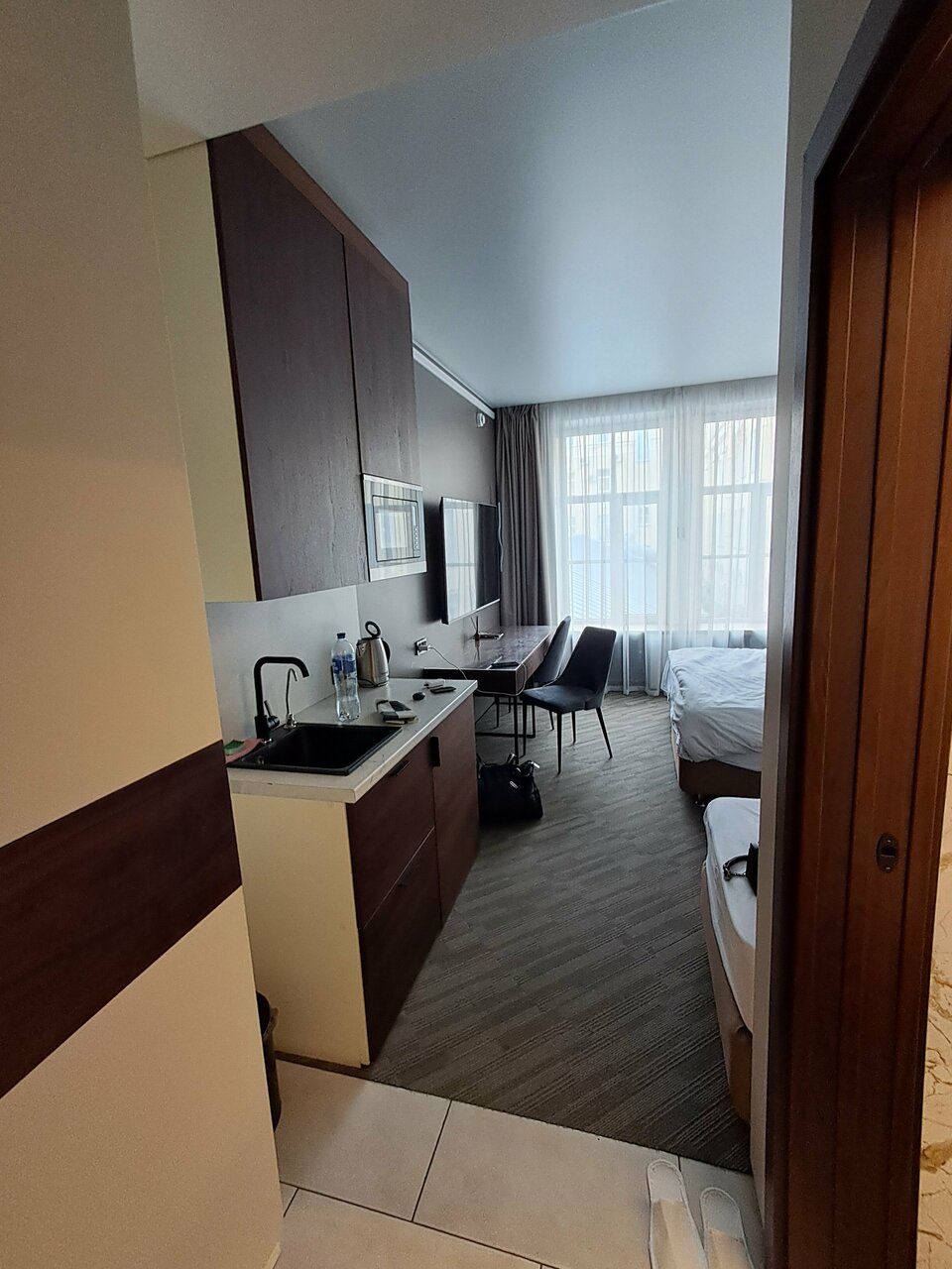 Отличный просторный номер, чисто, новая мебель, кофе машина, капсулы для кофе, необходимая посуда, плитка, микроволновка, чайник, удобное местоположение. Немного путаница с заселением, приехали рано, забыли предупредить, что оставим багаж, поэтому пришлось немного подождать, пока ответили в ват сап