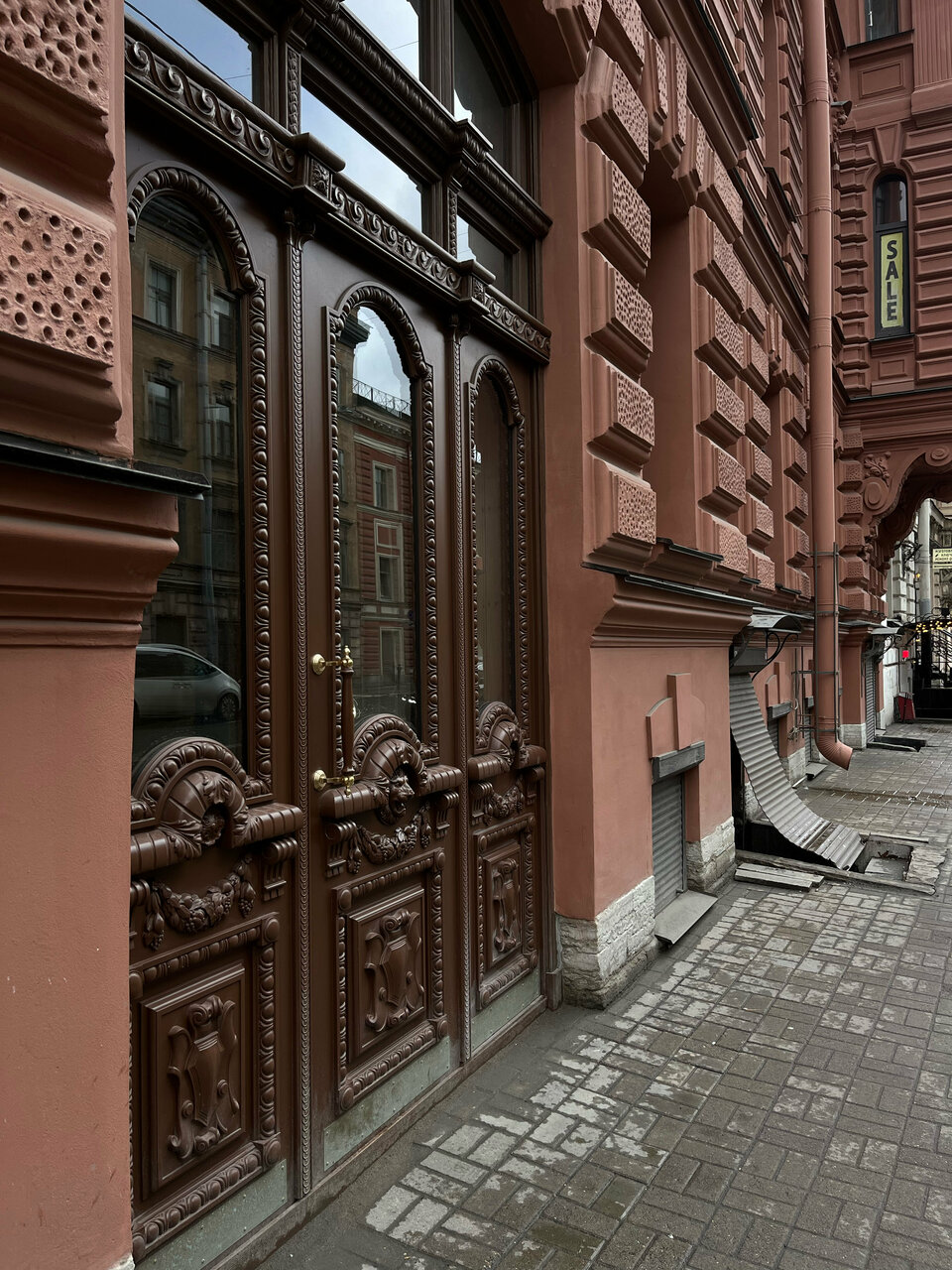 Дом на реставрации, все в лесах. Туалет общий на несколько комнат, хотя пишут удобства в номере. Дом без лифта.