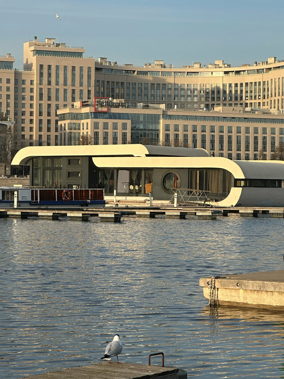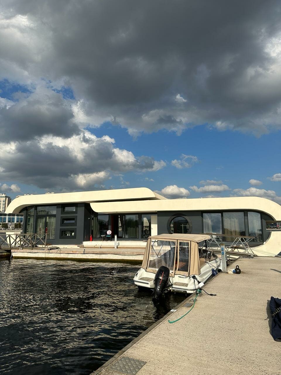 - Панорамные окна с видом на воду и город.; Удобное расположение в центре, рядом с яхтами и катерами.; Просторная кухня и гостиная.; Наличие необходимых удобств (вода, свет, холодильник, туалет).; Отсутствие посторонних людей.