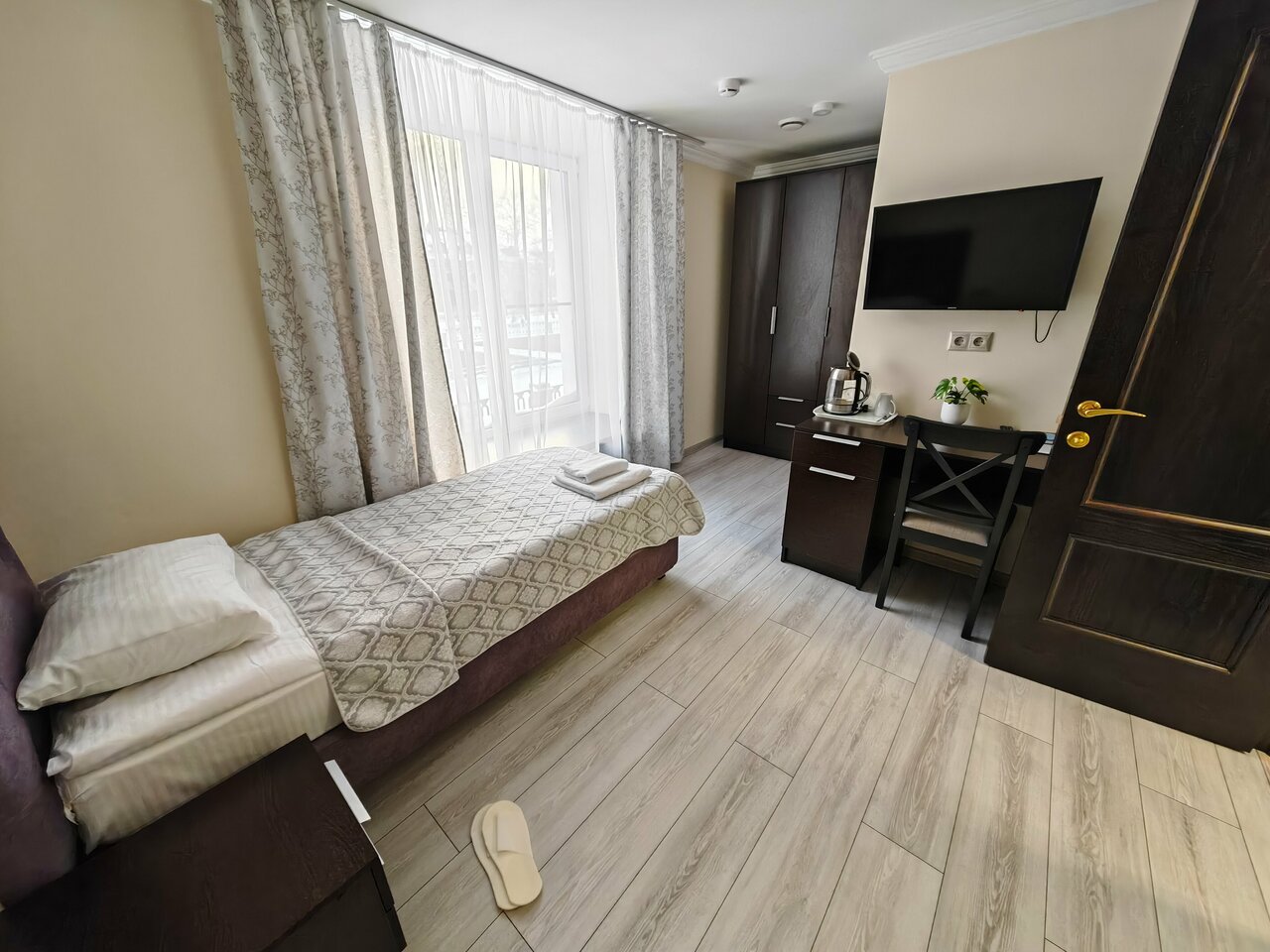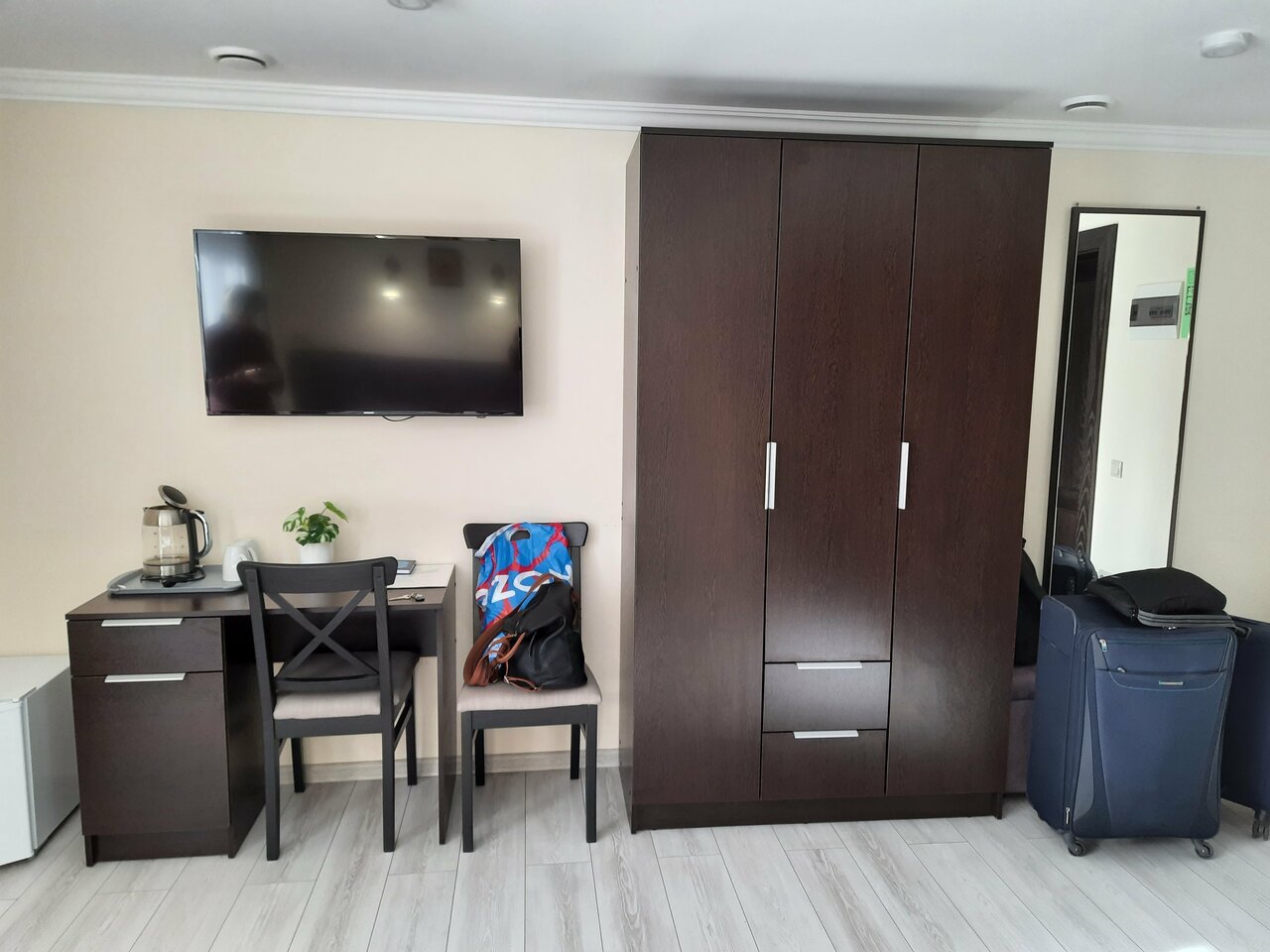 - Тихий и уютный отель.; Возможность парковки.; Наличие холодильника, чайника, телевизора.; Недорогая цена за качество.; Вкусные завтраки (включены в стоимость, большие порции).