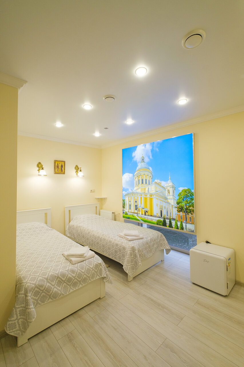 Февраль 23г.хуже,чем в доме паломника и доме паломника 2:нет халатов,зубных щеток/пасты,щетки для обуви,по чистоте тоже есть вопросы.Подогрев пола в ванной не работал/сломан/отключен.Номер был холодный,батареи закрыты..Двухместный улучшенный стандарт за 3300/ ночь можно было хоть з.щетки и положить)))