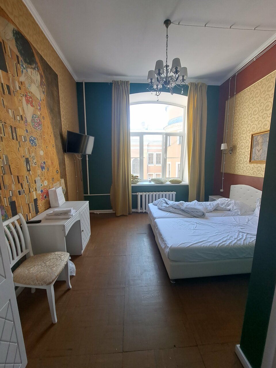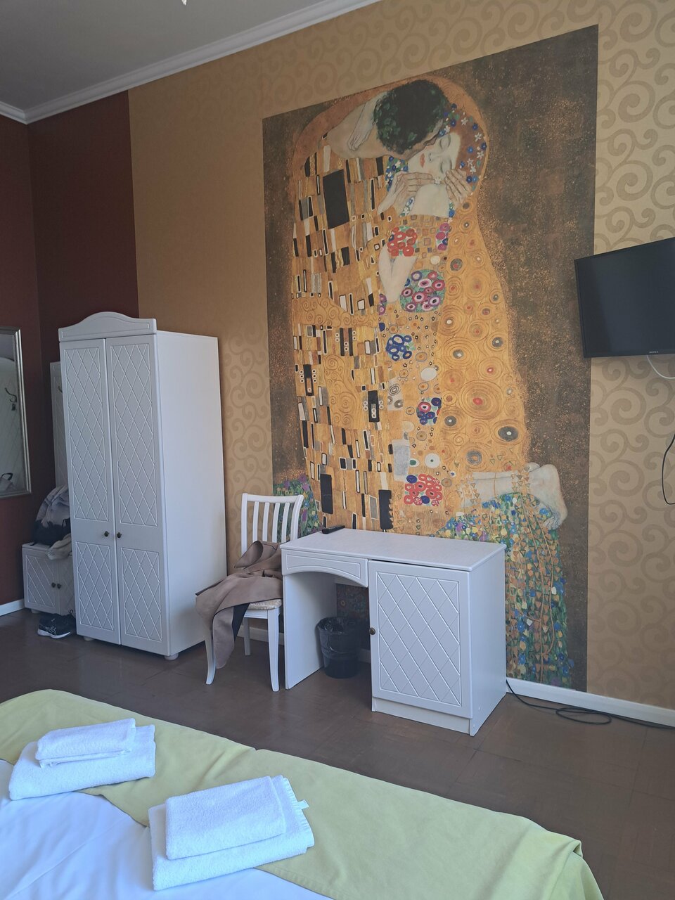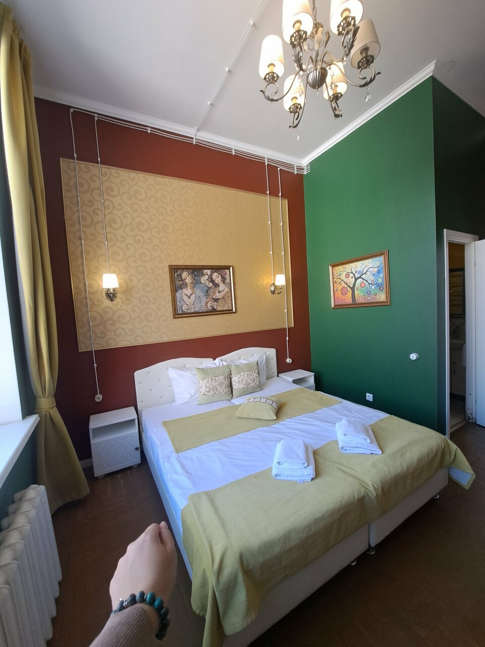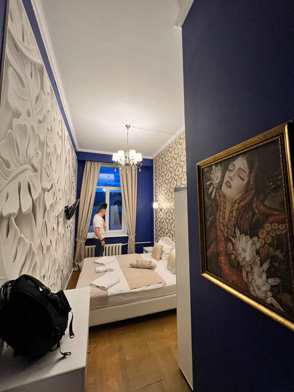 Небольшой отель находится на 4 этаже старого жилого дома и занимает одно крыло. Подъезд тёмный, с плохим освещением, старыми с выбоенами ступенями, требующий ремонта. Вывески с информацией о том, что здесь находится отель при входе в подъезд, нет. Табличка с названием отеля только на 4 этаже. При бронировании номера, сотрудники отеля будут с вами всегда на связи, пришлют подробную инструкцию, как найти отель, как зайти в подъезд, как пройти к лифту и т.д. Радует, что в подъезде есть лифт, хоть и маленький, старенький. Сам отель довольно приятный, яркий, есть все необходимое. В номере удобные кровати, свежее постельное белье, мягкие подушки. Также есть телевизор, столик, прикроватная тумбочки, небольшой холодильник. Каждый день оставляли средства гигиены (гель для душа, шампунь, мыло). Санузел в каждом номере, с душевой кабиной, феном.