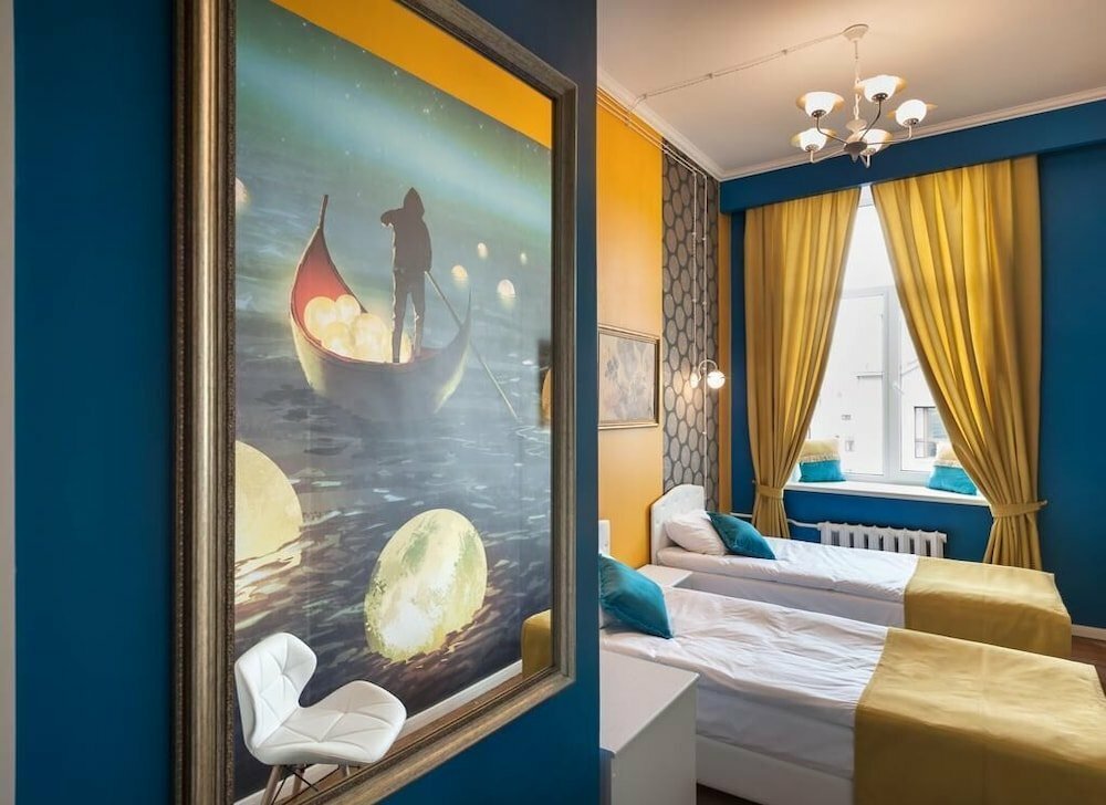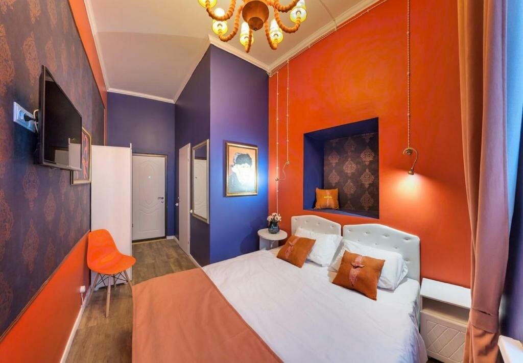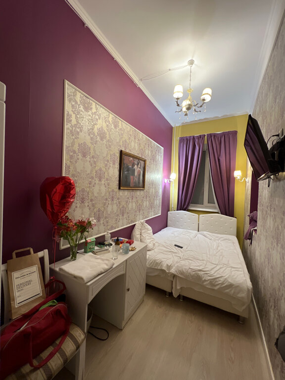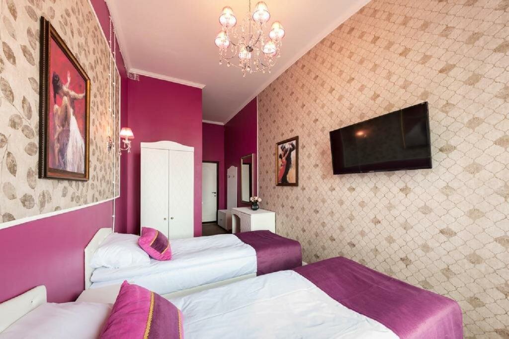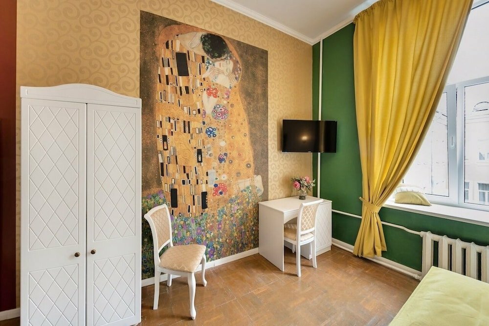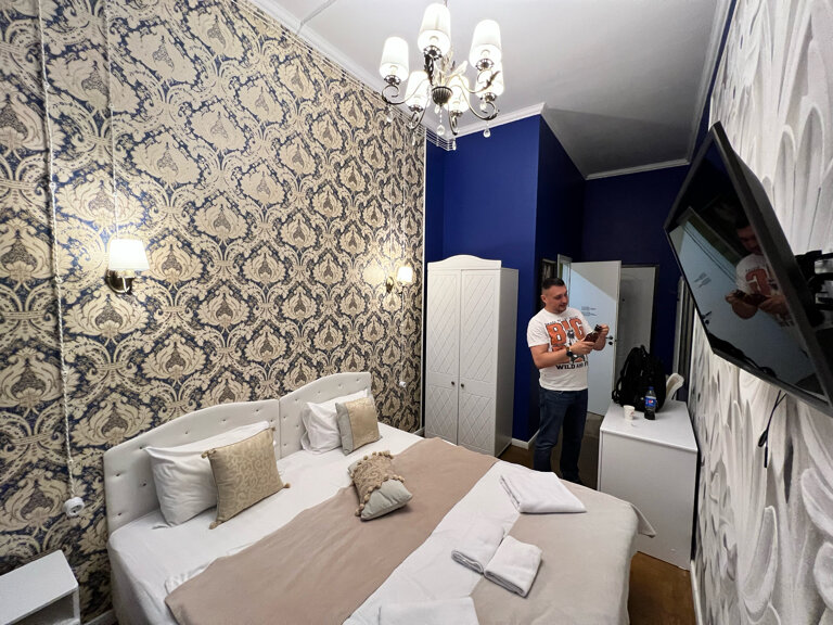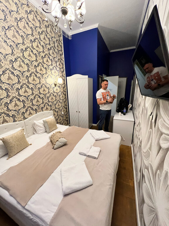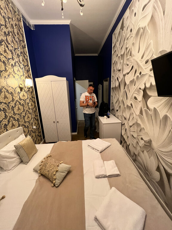 Небольшой отель находится на 4 этаже старого жилого дома и занимает одно крыло. Подъезд тёмный, с плохим освещением, старыми с выбоенами ступенями, требующий ремонта. Вывески с информацией о том, что здесь находится отель при входе в подъезд, нет. Табличка с названием отеля только на 4 этаже. При бронировании номера, сотрудники отеля будут с вами всегда на связи, пришлют подробную инструкцию, как найти отель, как зайти в подъезд, как пройти к лифту и т.д. Радует, что в подъезде есть лифт, хоть и маленький, старенький. Сам отель довольно приятный, яркий, есть все необходимое. В номере удобные кровати, свежее постельное белье, мягкие подушки. Также есть телевизор, столик, прикроватная тумбочки, небольшой холодильник. Каждый день оставляли средства гигиены (гель для душа, шампунь, мыло). Санузел в каждом номере, с душевой кабиной, феном.