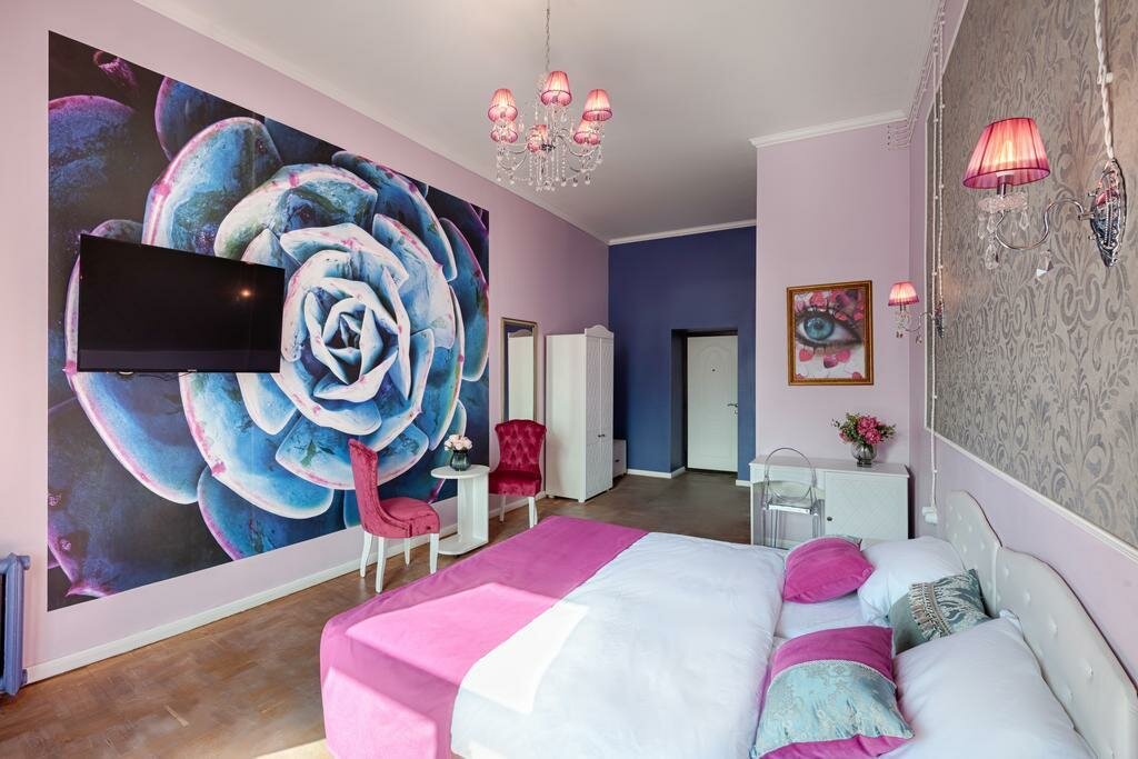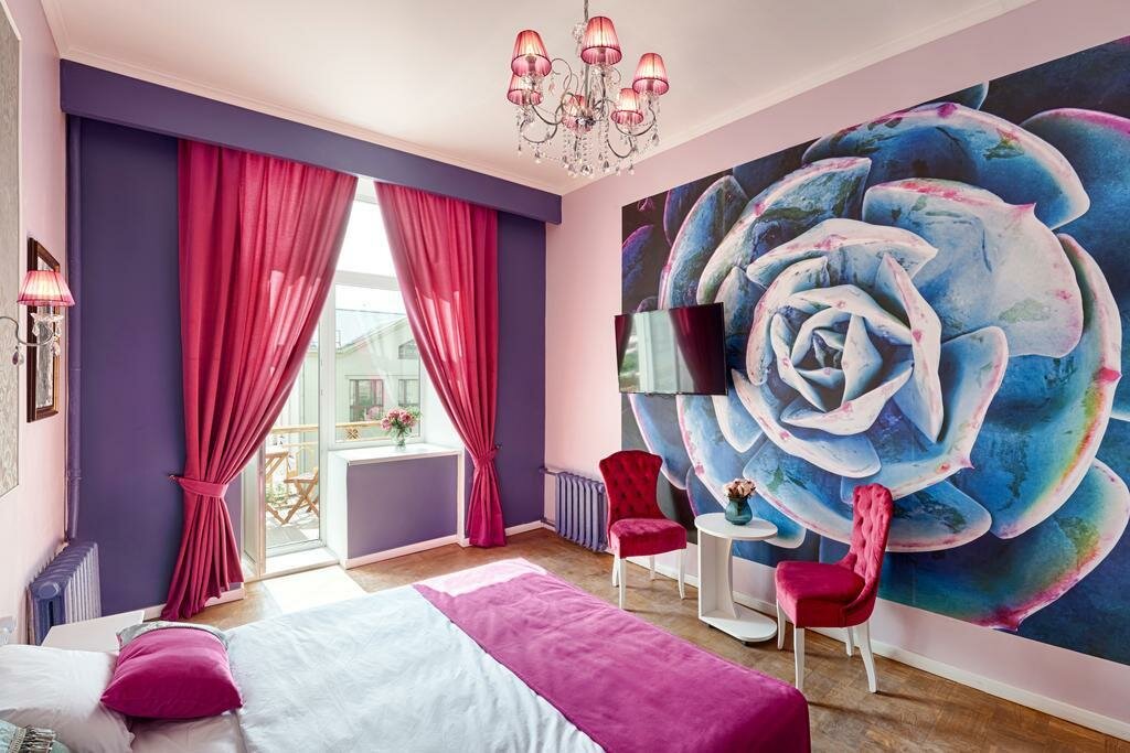 - Уютные и яркие номера, красивые картины на стенах.; Удобные кровати, свежее постельное белье, мягкие подушки.; Наличие телевизора, столика, холодильника, фена.; Ежедневное пополнение средств гигиены.; Приятный и необычный интерьер.