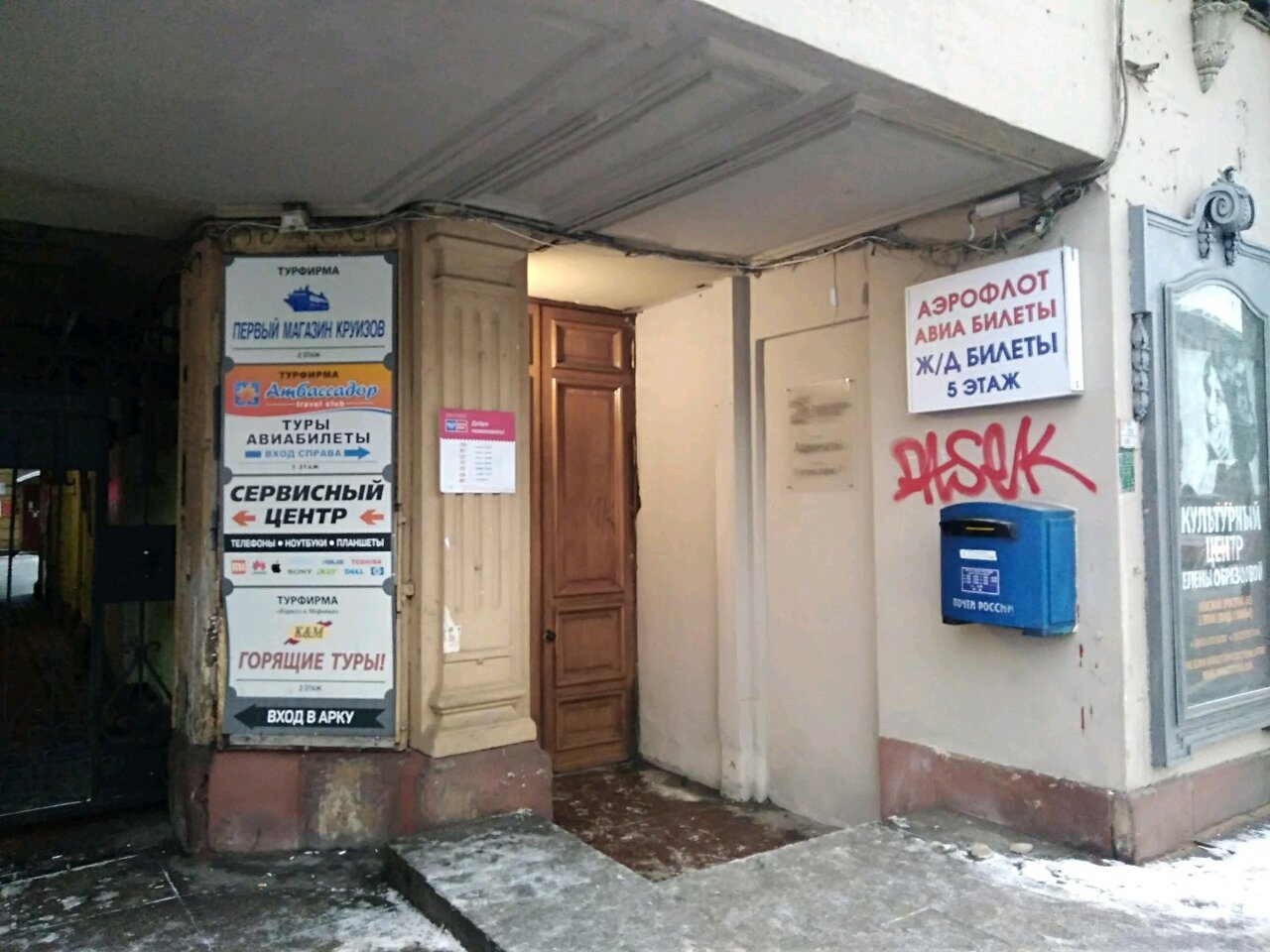 Красивое историческое здание, но внутри требует ремонта, выглядит не очень свежим. В здании много офисов — есть адвокаты, почта, азиатское кафе с напитками, концертный зал и салон красоты. Удобно, что есть лифт. Огромные окна на Невский проспект, шикарный вид!