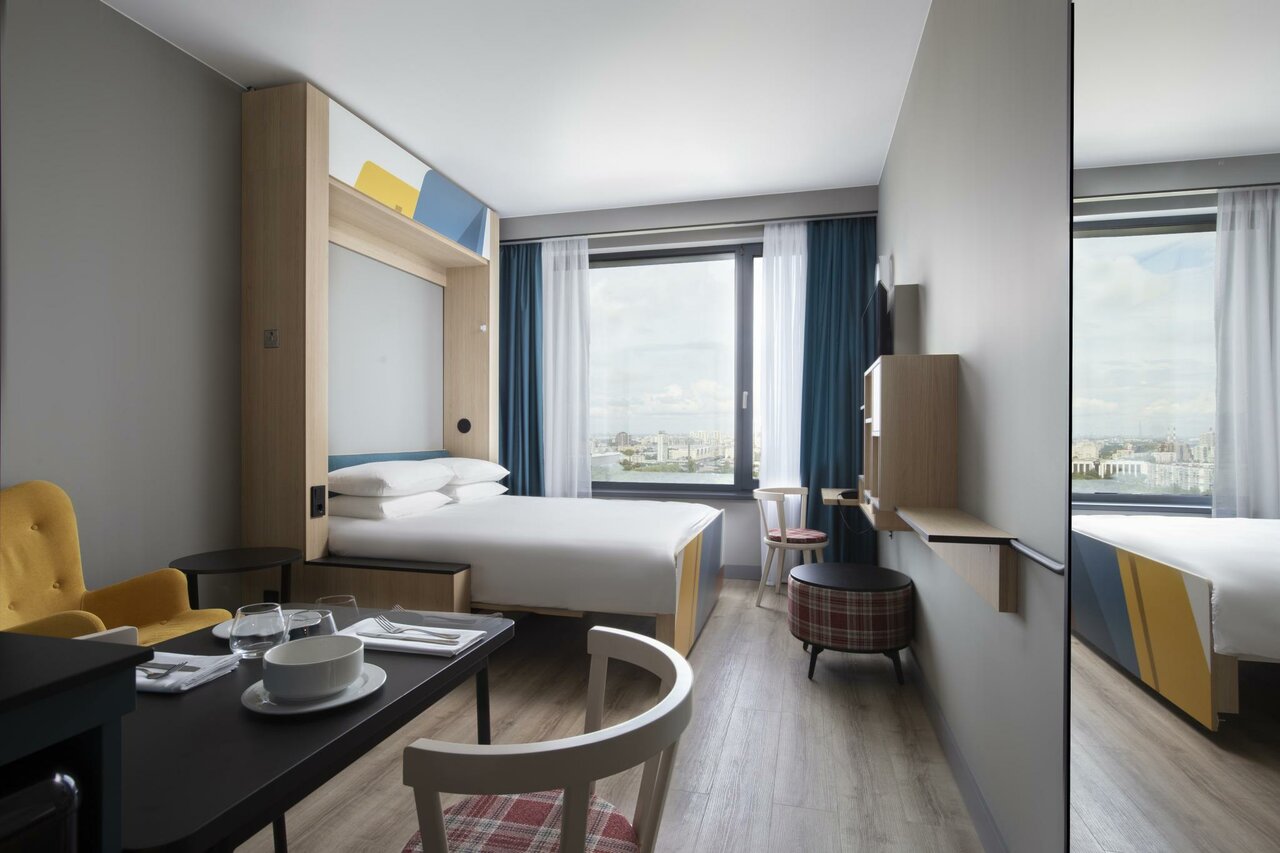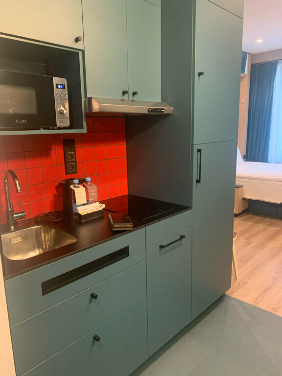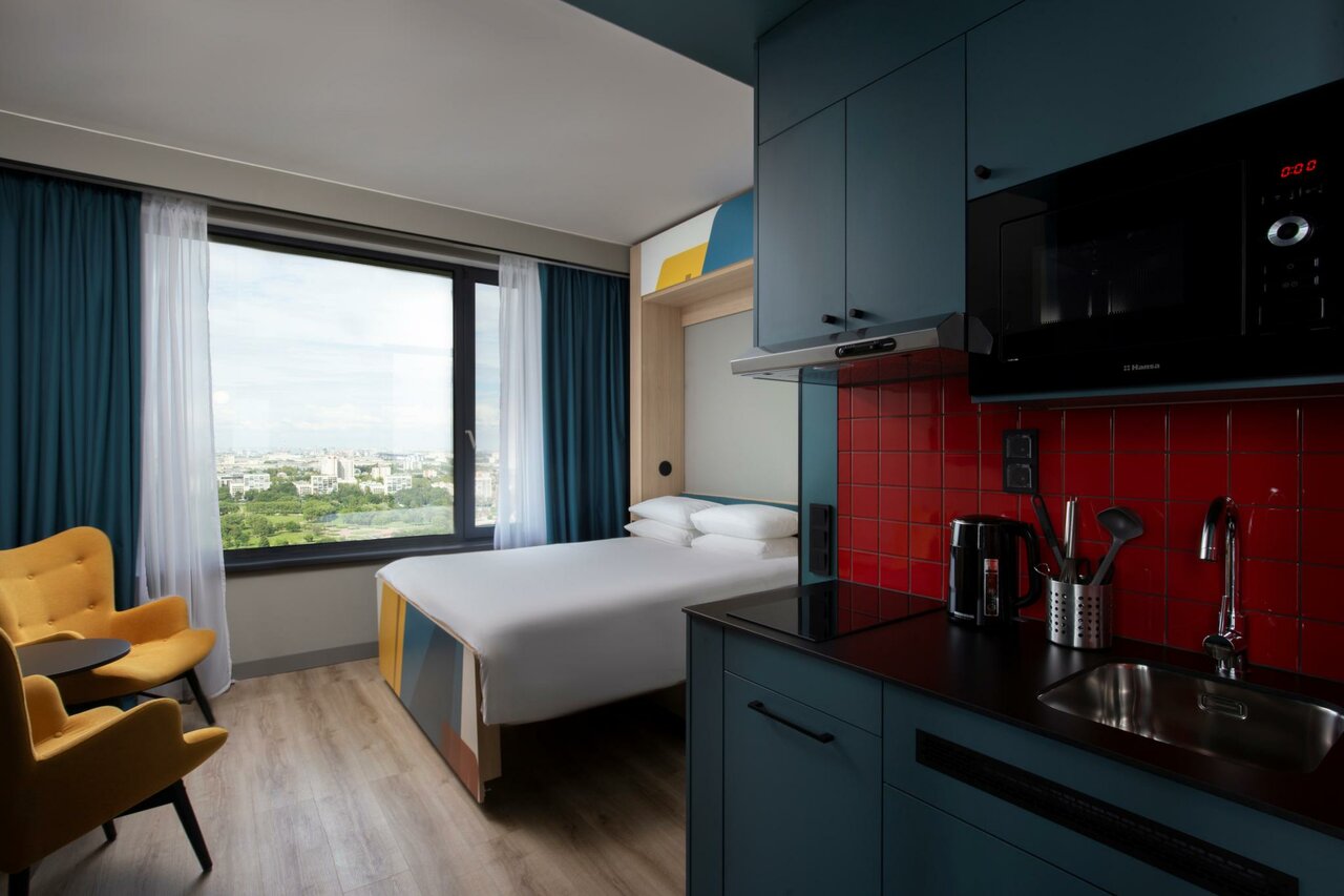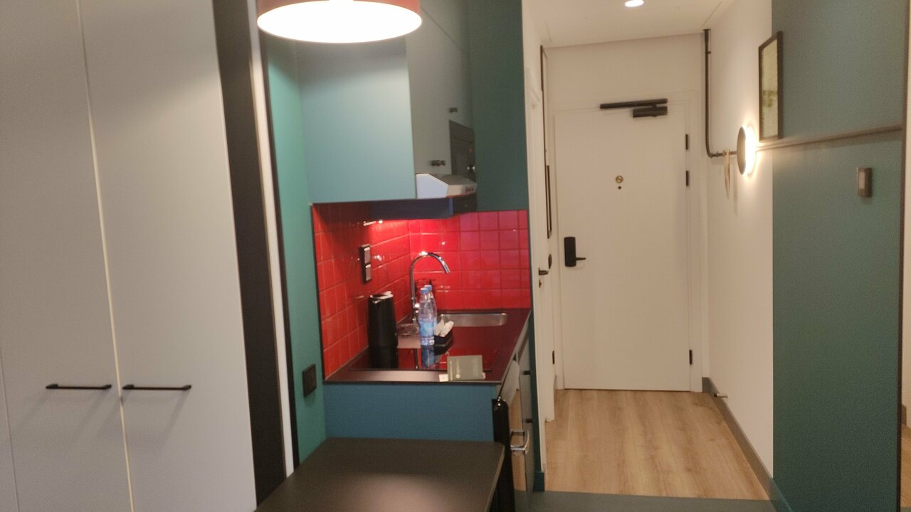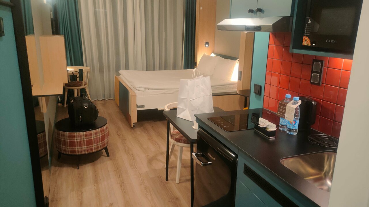 Новый, чистый, современный. Апартаменты удобные, есть все необходимое для приготовления еды. В отеле и в номере все блестит от чистоты. Расположение удобное, рядом метро, множество магазинов и кафе.