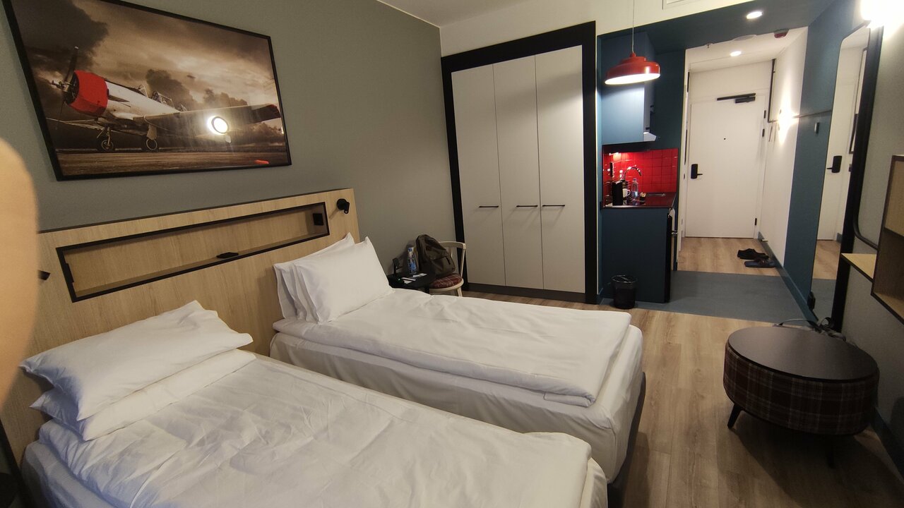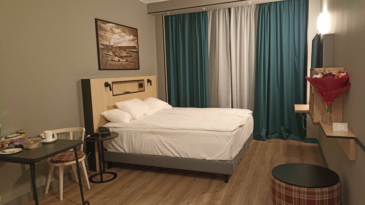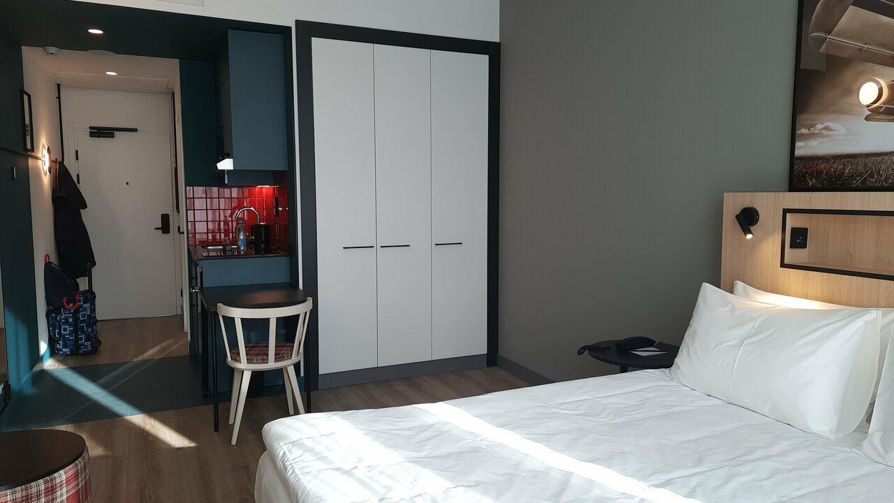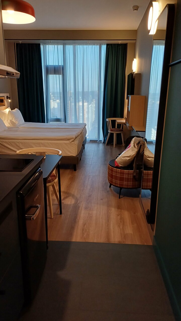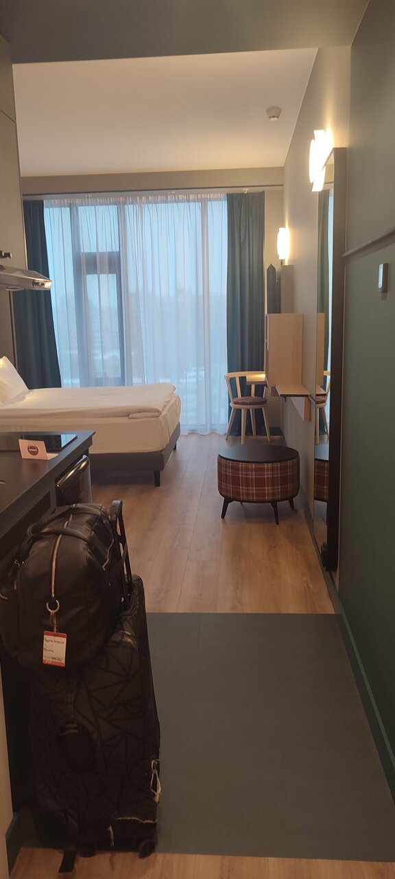 Останавливались в этом отеле в конце сентября 2024г., отель расположен рядом с аэропортом, что очень удобно. Сам отель современный, с красивыми просторными номерами, есть кухонный уголок, где есть чайник, плита и посуда. В отеле очень вкусные разнообразные завтраки. На первом этаже есть круглосуточный бар.