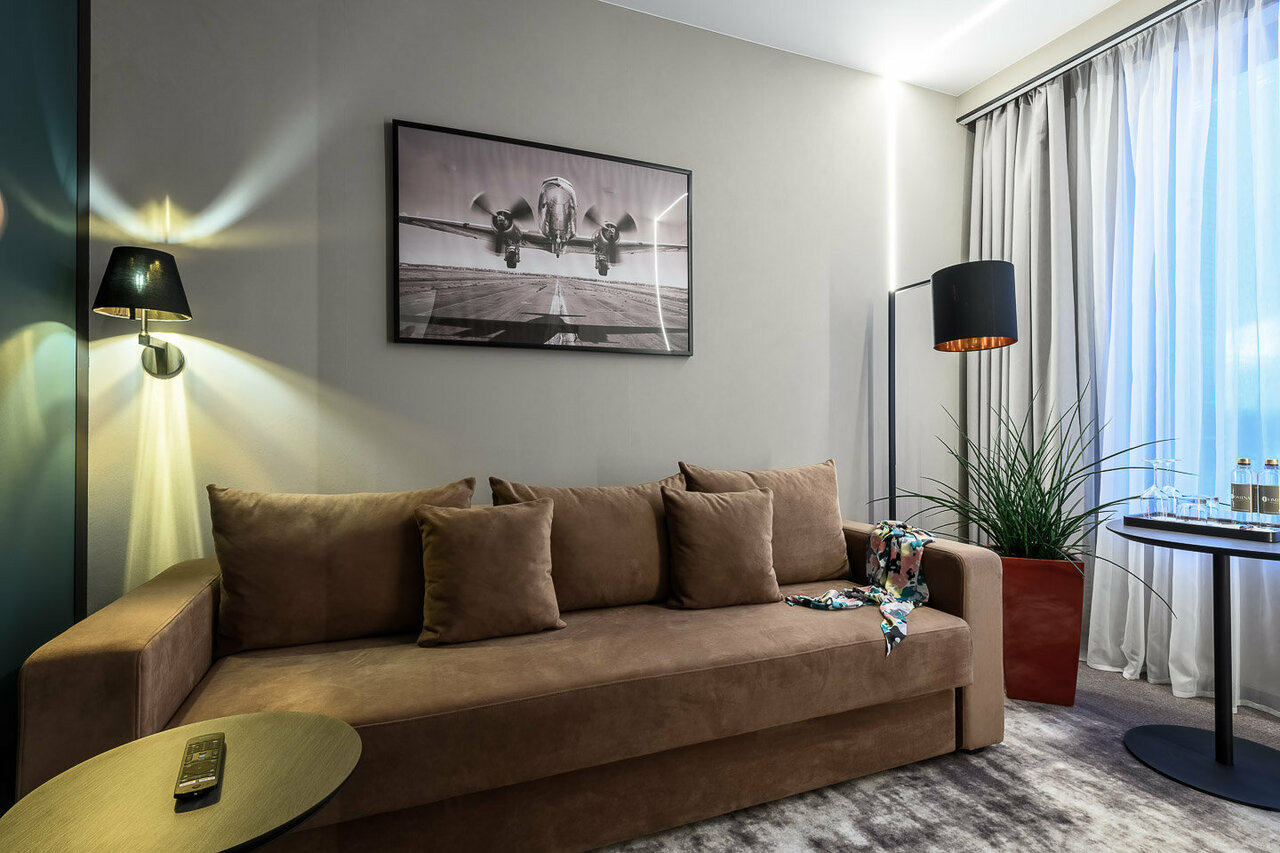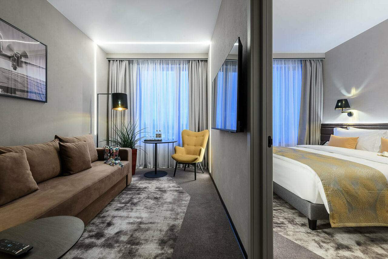 Просторный двухкомнатный номер. Оснащение: TV, Wi-Fi, мини-бар, чай, вода, утюг, сейф. Ванная комната с феном и набором индивидуальных банных принадлежностей.