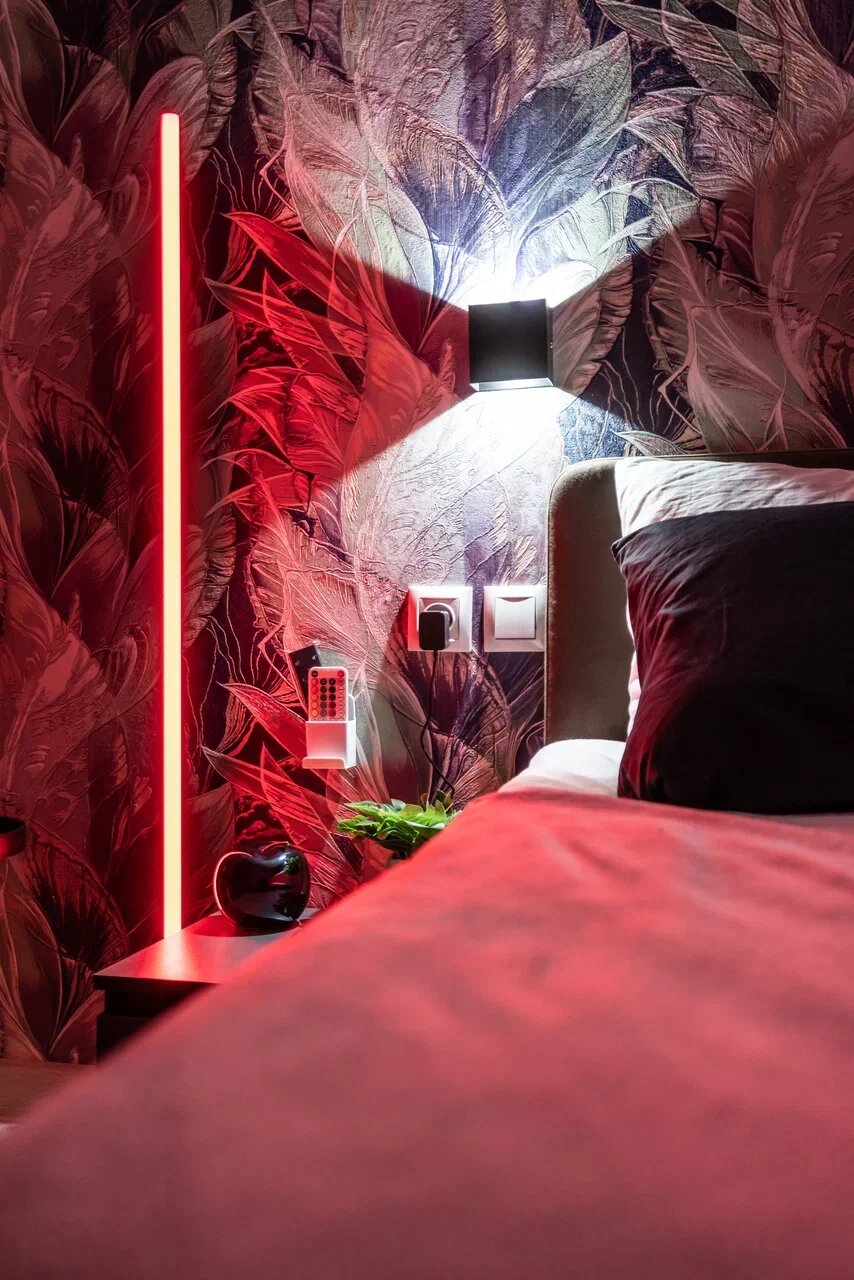 Большой номер со всеми удобствами и видом на улицу. Дизайнерская душевая комната. Огромный телевизор. Кровать Кинг-Сайз с ортопедическим матрасом и другие удобства . Апартаменты в неоновой подсветке для создания любой атмосферы