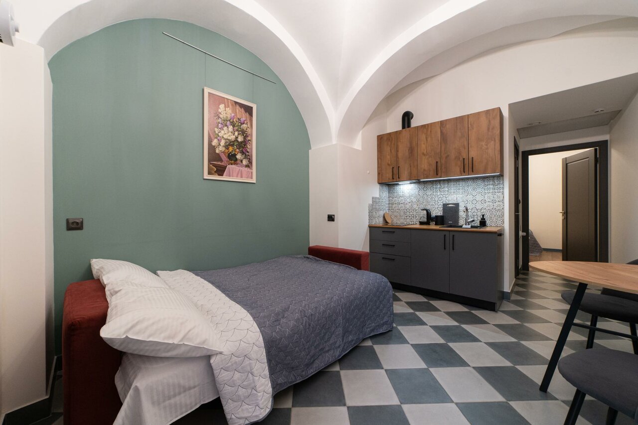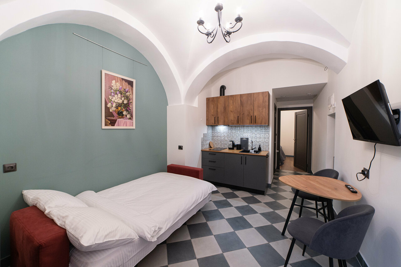 Приятный номер с отдельный входом. Номер хорошо укомплектован(удобства, холодильник, фен, кухня, утюг). Чисто и уютно, тихий двор с самом центре города. Рядом 2 станции метро и различные достопримечательности.
