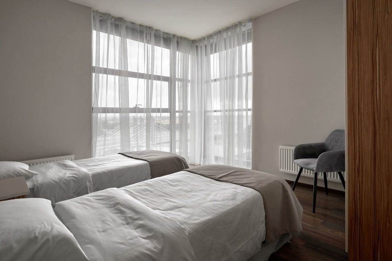 Просторные двухкомнатные апартаменты площадью 53 кв.м. включают в себя две изолированные спальни, кухню и раздельный санузел. Прекрасный выбор для семей с детьми старшего возраста, компаний из 4-х человек или двух коллег, путешествующих по работе.