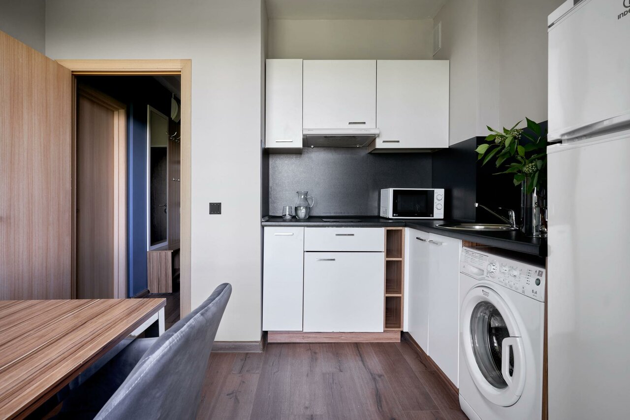 Классический номер-студия площадью 24 кв.м. с удобной двуспальной кроватью, полностью оснащенной кухней и собственной ванной комнатой.