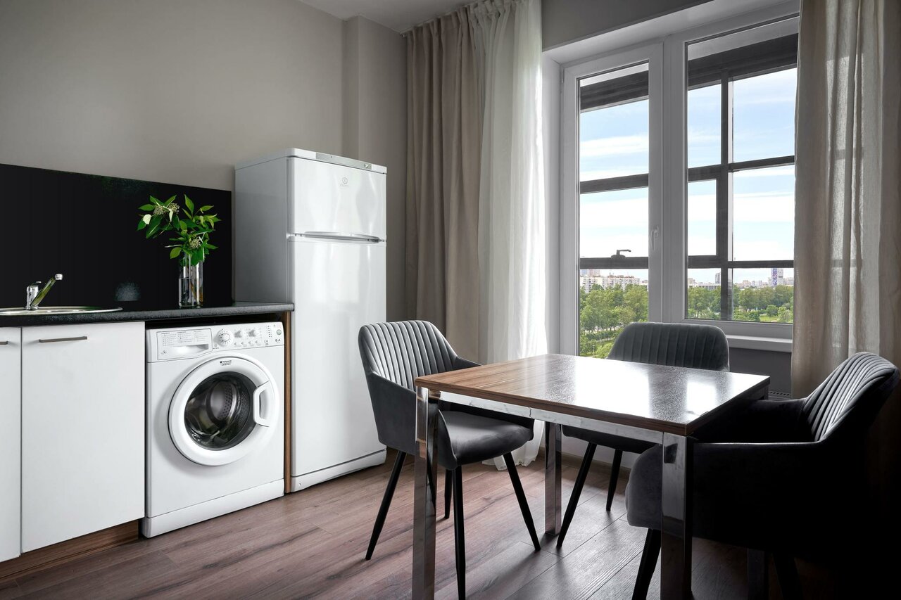 Очень приятное место и очень удобное. Рядом аэропорт и остановка ОТ. Ближайшее метро Московская в семи минутах на автобусе. В самом доме пятерочка в соседнем подъезде, в соседних домах другие магазины и места, где можно перекусить. Номер минималистичный, есть утюг, доска, минимум посуды, гигиенические средства, фен, душевые поинадлежности. Все отлично.. Единственный минус пожалуй, душ. Душевая кабина с крутилками как на джостике, очень сложно разобраться с первого раза, сложно выбрать напор, сложно установить нужную температуру. Возможно проблема с температурой не от кабины зависит, а вообще во всем доме. Но это было испытание каждый раз. Понимаю, что это непросто, ну лучше бы кабину с обычными регуляторами, как на кране в раковине. Эти крутилки сбивают.