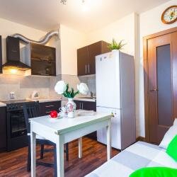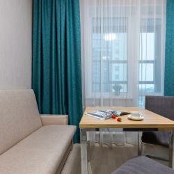 Условия: — Просторные номера с кухней, техникой (ТВ, микроволновка, плита), Wi-Fi, застеклённой лоджией. — Возможно проживание с животными (платно). — Услуги: парковка, тренажёрный зал, крытый бассейн, ресторан, СПА, трансфер (платный). — Заезд с 14:00, выезд до 12:00. Возвратный депозит — 2000 ₽.