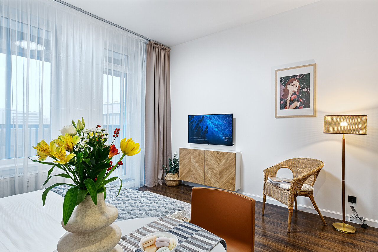Залог не требуется. КУ и сервис включены. В вашем распоряжении полностью оборудованная миникухня, собственная ванная комната, удобная кровать (TWIN / DOUBLE), телевизор, рабочий стол.