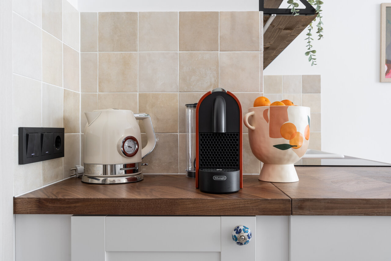 - Оснащенная кухня (плита, холодильник, микроволновка, чайник, кофемашина, посуда).
