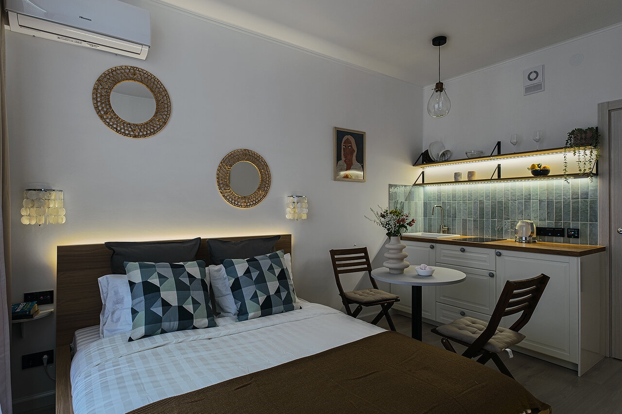 Останавливались вдвоем на короткий срок в апартаментах. Изначально выбрали квартиру, но она оказалась занята на нужный нам период и хозяин оперативно предложил аналогичный вариант в соседнем корпусе. Все замечательно: квартира, как на фото, чистая, уютная, использование натуральных материалов в интерьере добавляет тепла. Место локации удобно для поездок и прогулок. Администратор всегда на связи. Надеюсь, еще воспользуемся данным предложением.