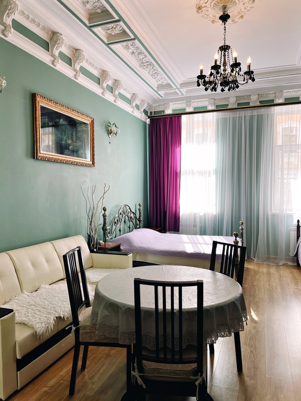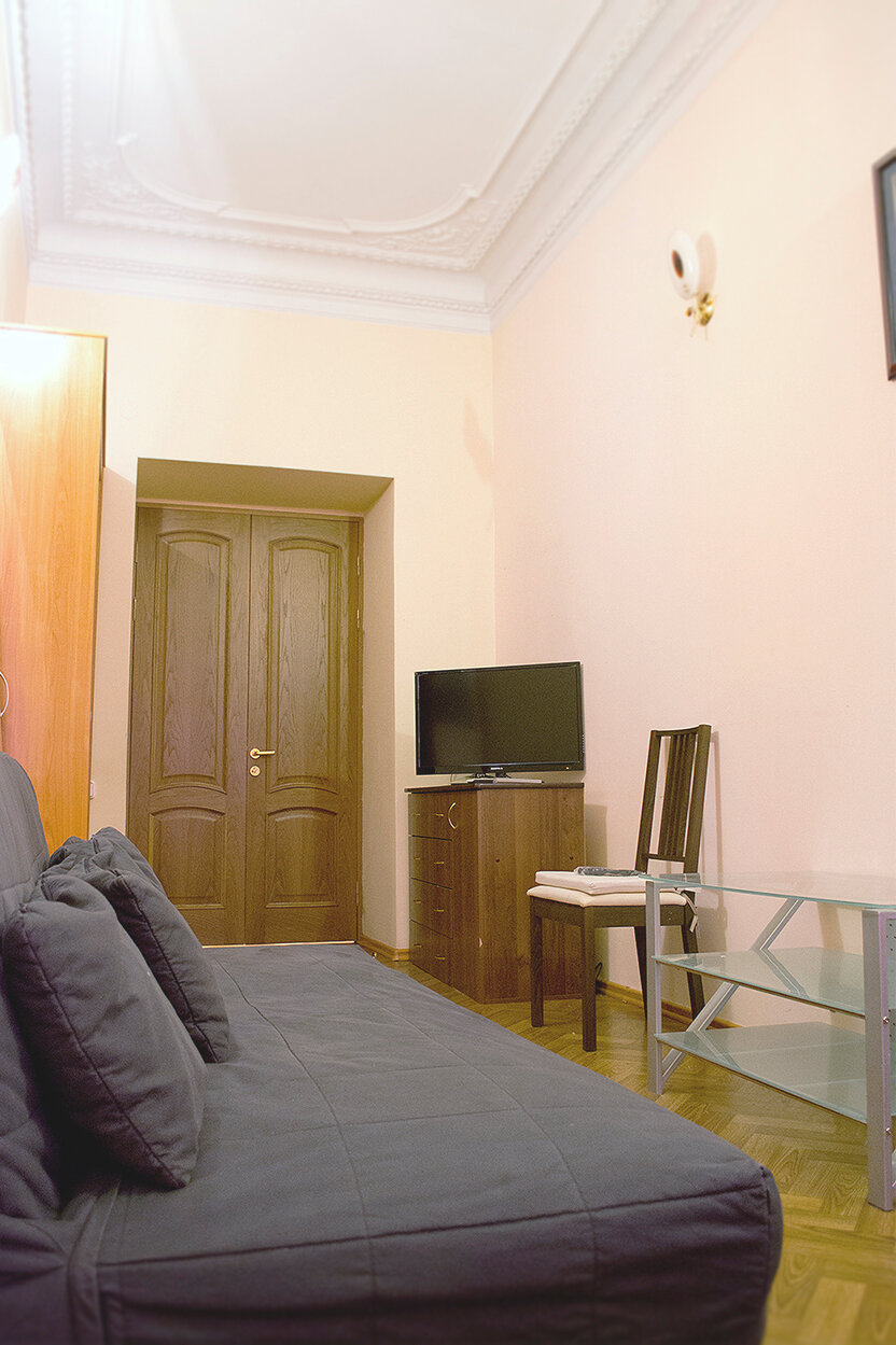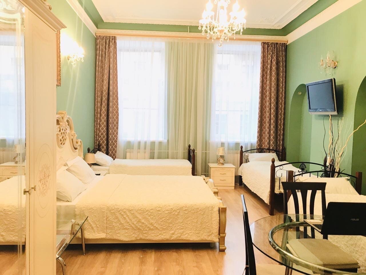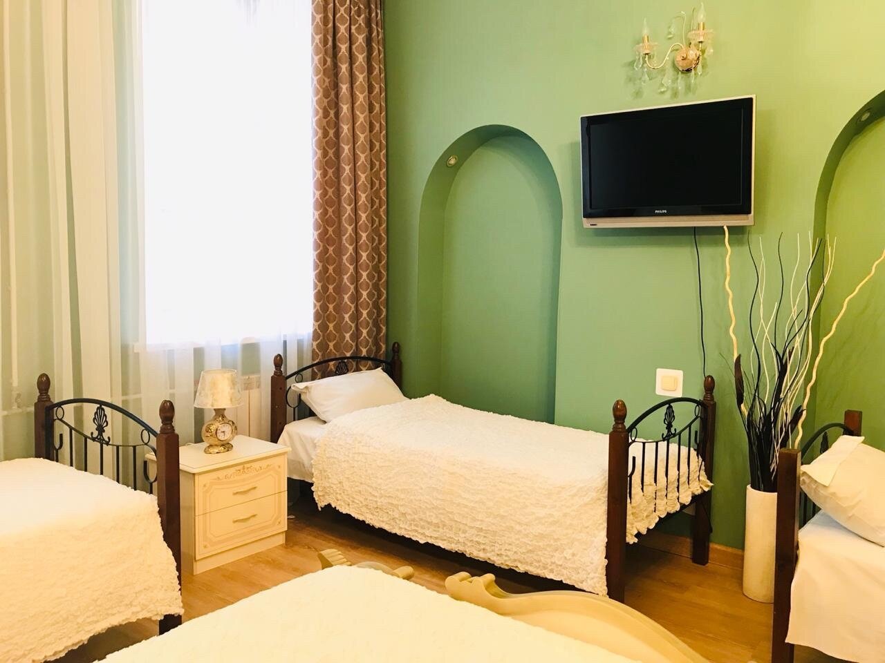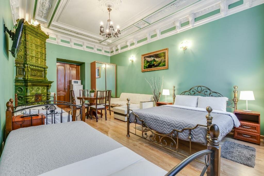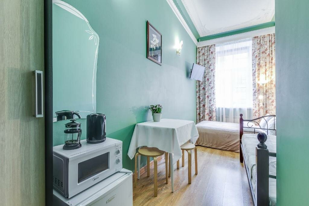 Удобное расположение,спокойное место,рядом продуктовые магазины и столовая,хотя готовить мы могли и в самой гостиннице,что и делали на завтраки.Особое настроение придают старинные лестничные пролеты с коваными узорами перил,колодцы из домов старого города….Все необходимое есть в номере-фен,сушилка,микроволновка,чайник и холодильник,компактная новая сантехника.И настоящая узорная лепнина на потолке…Нам с мужем очень понравилось.