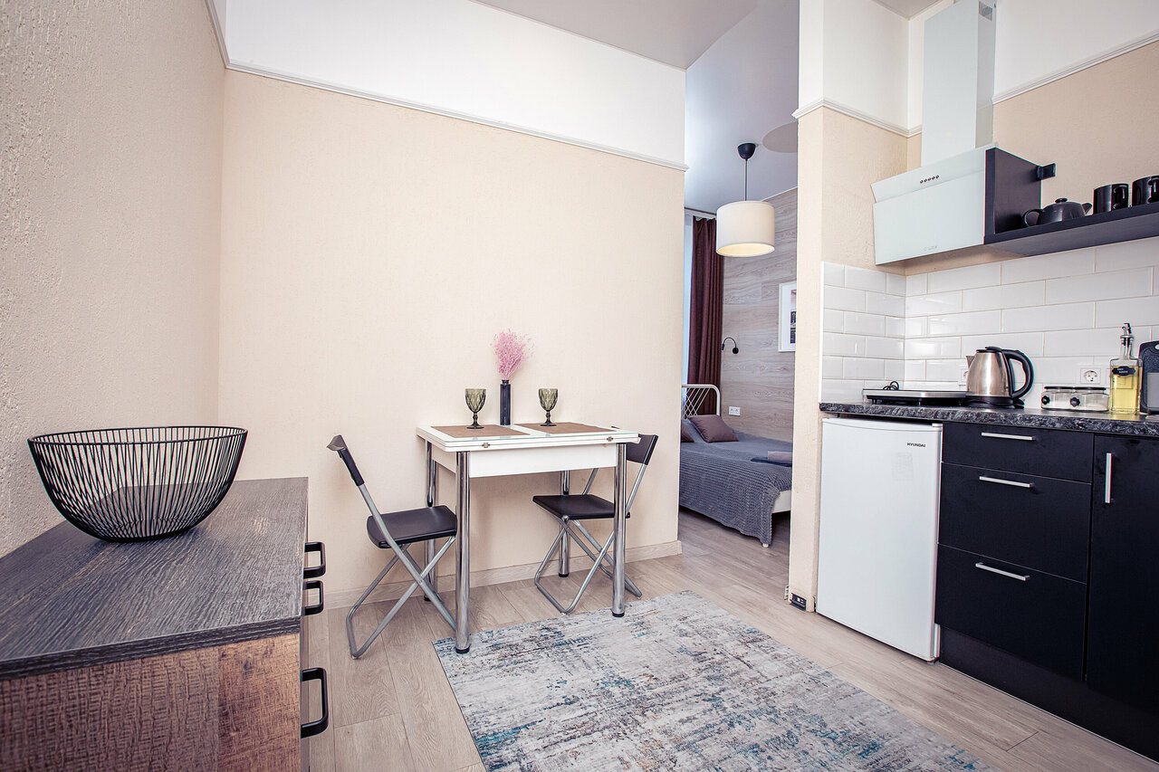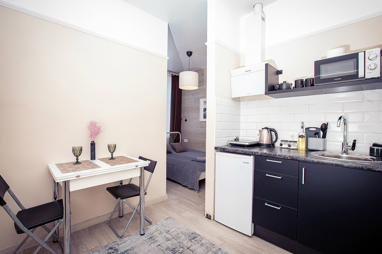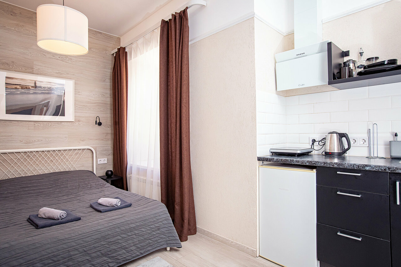 Студия понравилась, всё есть,что заявлено на сайте. Место спокойное, окна выходили во двор. Только не было света в прихожей.