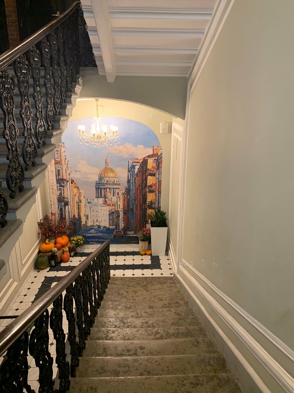 - Красивое старое здание с высокими потолками и лестницей.