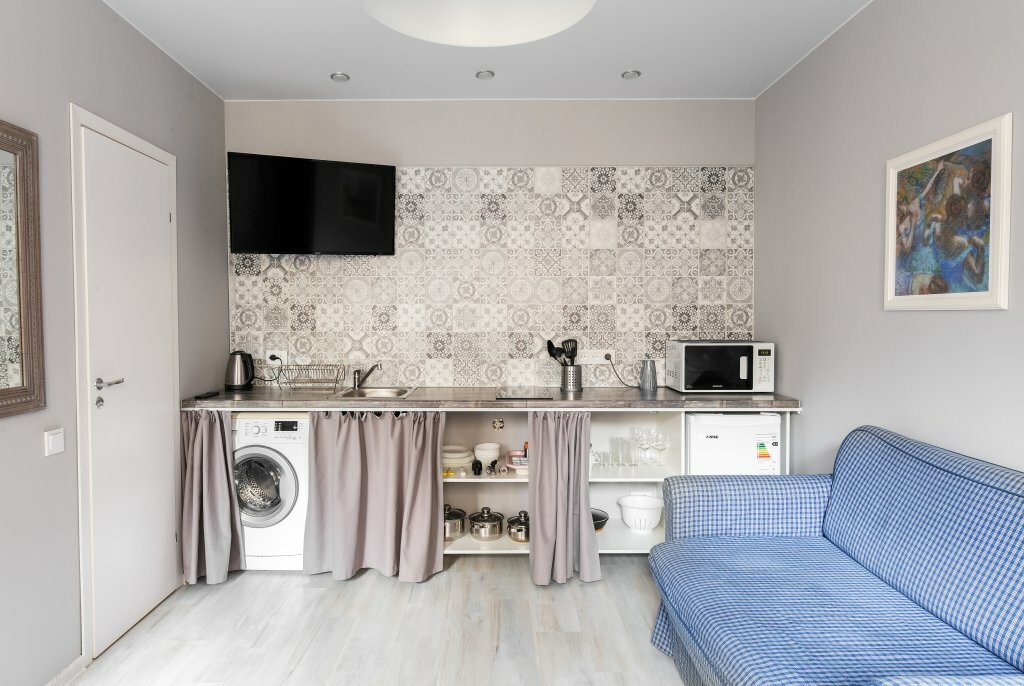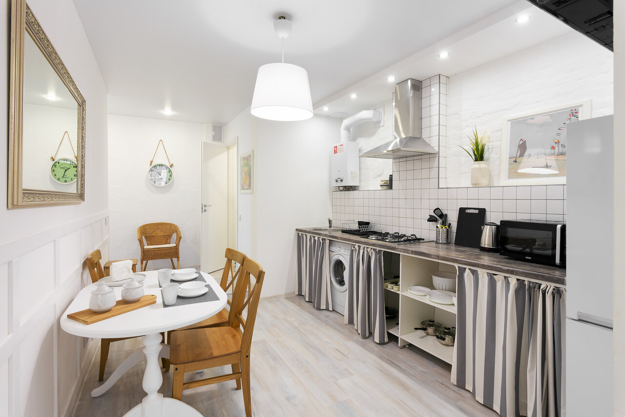 - Полная комплектация (стиральная машина, кухня, утюг, достаточное количество полотенец).