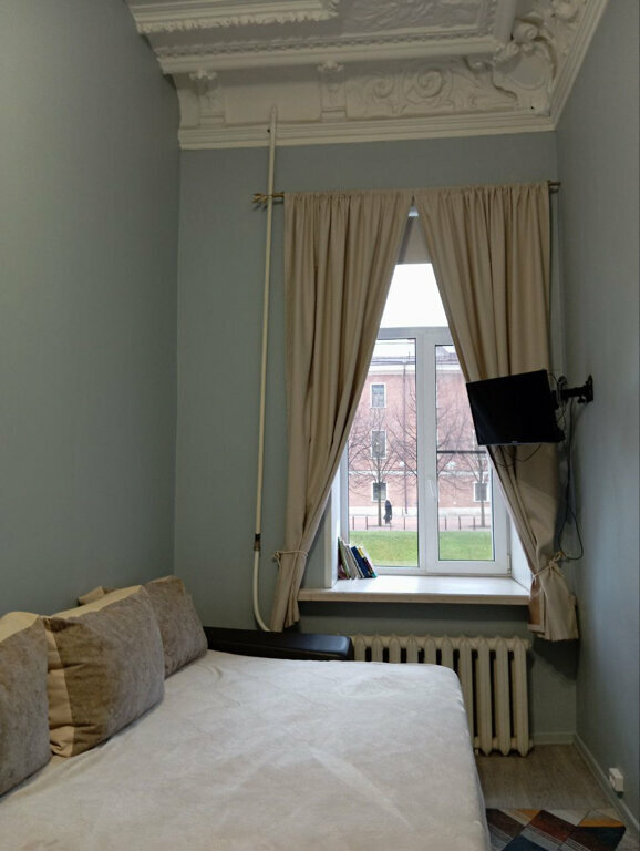 Старая коммунальная квартира, требующая ремонта. Был обнаружен таракан, который уполз под плинтус в ванной комнате. При заселении даже не проверили наши документы. Снимали номер семейный с отдельным санузлом. Слив в душевой работает плохо, туалетная бумага дефицит, было меньше чем пол рулона. В комнате женский носок на трубе. Стиральная машинка 100р стирка, утюг бесплатно но грязная подгоревшая, подошва. Из плюсов расположение, центр, недалеко от Исаакиевского собора.