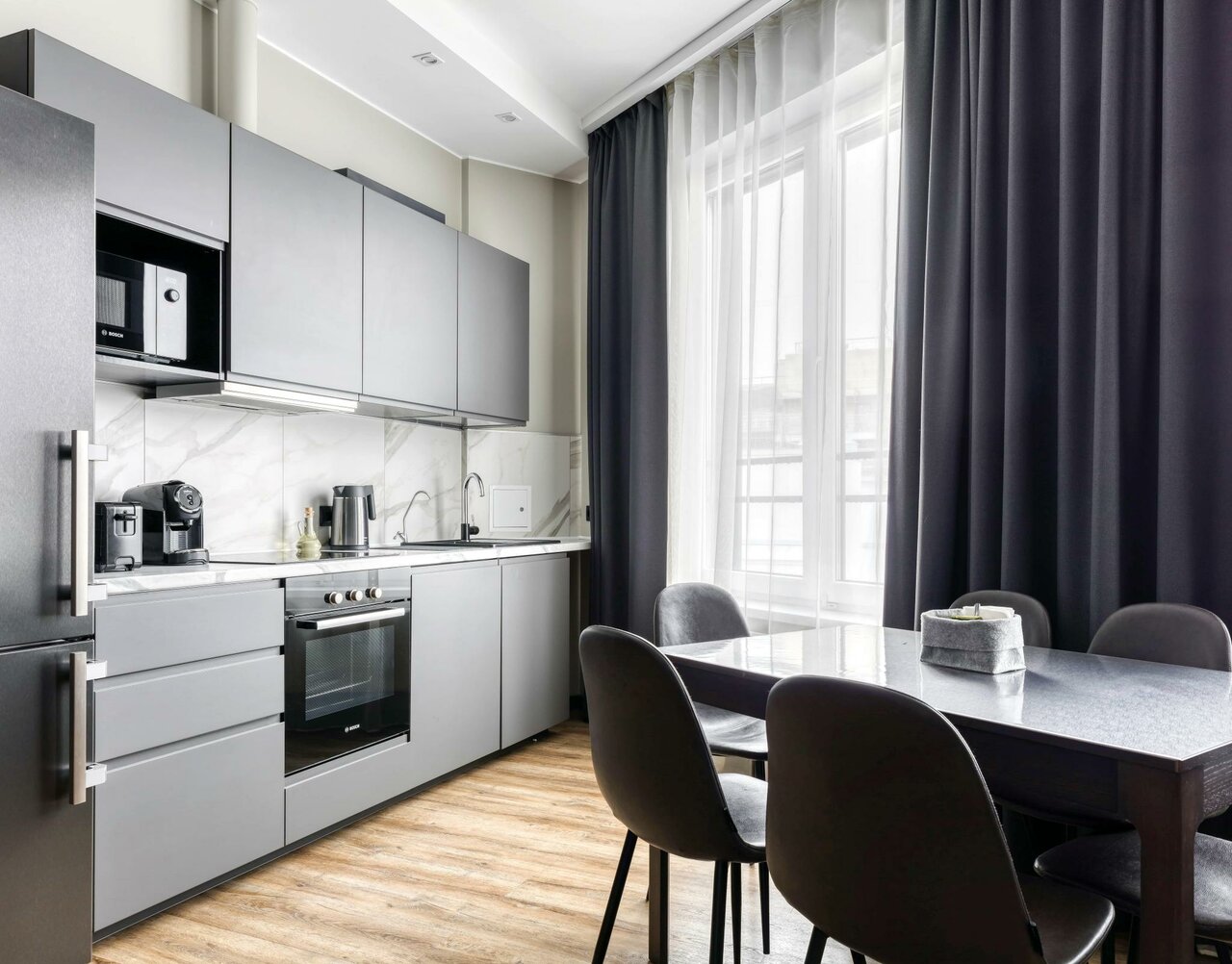 Замечательный отель! Очень удобное расположение: рядом метро, несколько ресторанов, магазины. Можно прогуляться до реки. Мы жили в улучшенном номере (один взрослый и двое детей) с 18 по 23 мая. Все продумано вплоть до стиральной машины, гигиенические принадлежности есть. Если что-то нужно, персонал реагирует сразу. На завтраках всего достаточно. Каша, сырники, яйца, сосиски, йогурты, нарезка, масло, сыр. Что-то еще..)). Т.к. заезжали поздно, заказали ужин в номер . Ооочень сытно и вкусно!!!. Спасибо сотрудникам отеля и процветания вам!!!
