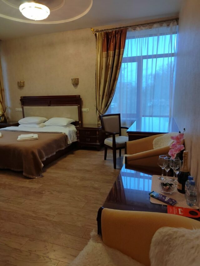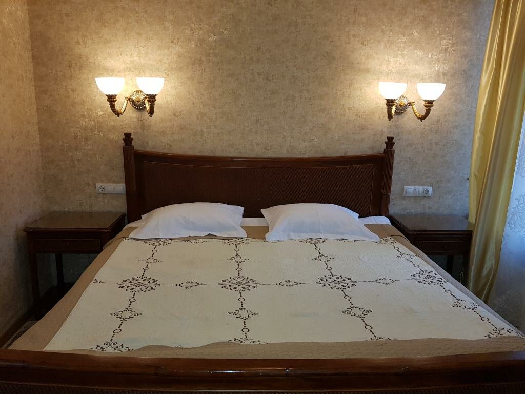 Отель 3 зведны. Маленькие но чистые номера, душевая кабина, туалет смежные. Убирают каждый день. Мебель конечно старовата, но ещё достаточно крепкая. Телевизор, маленький холодильник, электрический чайник есть в номере, всё рабочее. В прохладное время можно включить обогреватель, греет хорошо. Единственное пожелание на будущее, если это будет возможно, преобрести стиральную машину, т. к. если заселиться на 5-7 и более дней, ещё и с детьми, не плохо было бы иметь возможность постирать вещи.