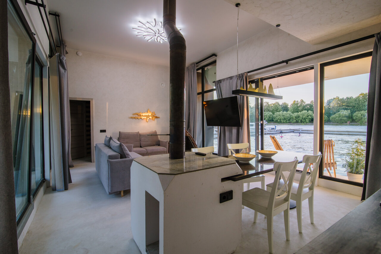 - Просторный, подходит для большой компании или романтического вечера.; Близость к метро (10 минут пешком).; Тёплые комнаты (в некоторых отзывах).; Отличная локация (в городе, но с видом на воду).; Идеальное летнее место для праздника.