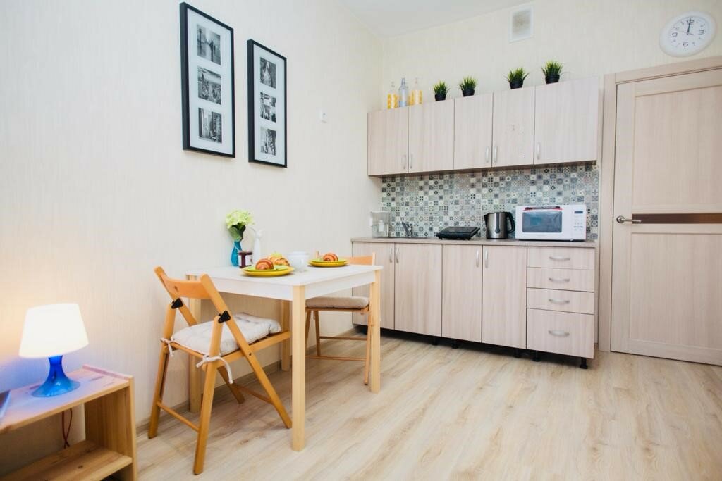 Снимали номер на втором этаже. Кухня — гостиная и спальня. На кухне раскладной диван. Из плюсов: чисто, в номере вся бытовая техника есть (стиральная машина, холодильник, микроволновая печь, плита, чайник, фен, утюг, два телевизора), также с посудой проблем не было, всё предоставлялось. Магазины рядом, пятёрочка, магнит. Также бар, столовая, кафе. Из минусов: не очень удачное местоположение, от вокзала (Московского) ехать на машине 35 минут, до центра 40 минут, до Петергофа 1 час. Пожалуй наверно единственный значимый минус, хотя это кому как, смотря кто для чего едет.