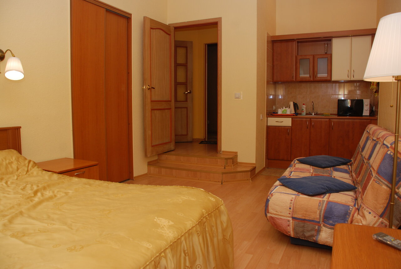 Красивый просторный семейный номер-студия оборудован 2 односпальными кроватями (1 двуспальной кроватью) и раскладным диваном.Номер имеет мини-кухню с посудой, микроволновую печь, мультиварку, оформлен в светлых тонах, с напольным покрытием.Ус
