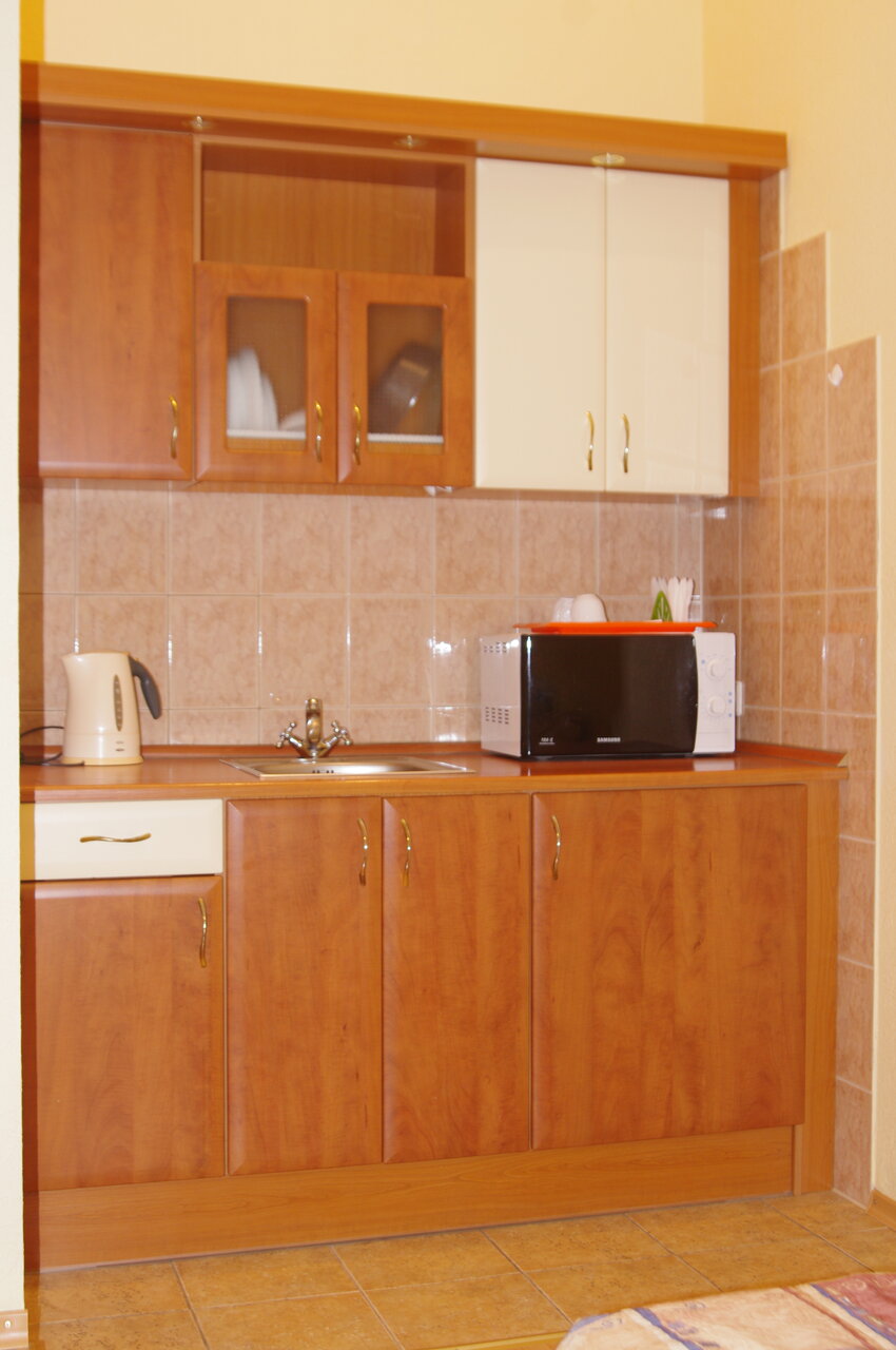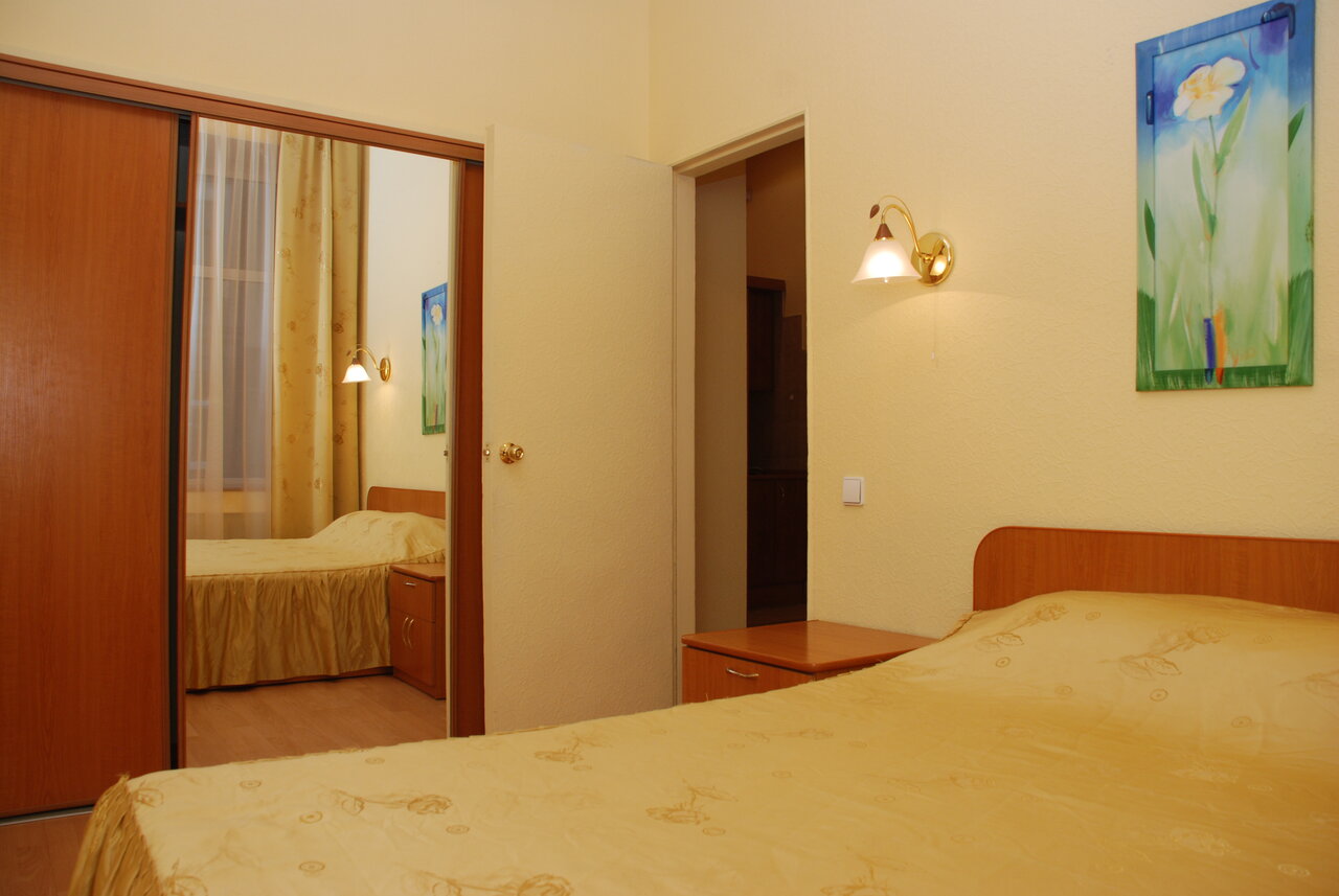 Красивый двухкомнатный семейный номер оборудован двуспальной кроватью и раскладным диваном. Номер имеет мини-кухню с посудой,микроволновую печь, мультиварку, оформлен в светлых тонах, с напольным покрытием.Услуги и удобства: Кондиционер, Мини