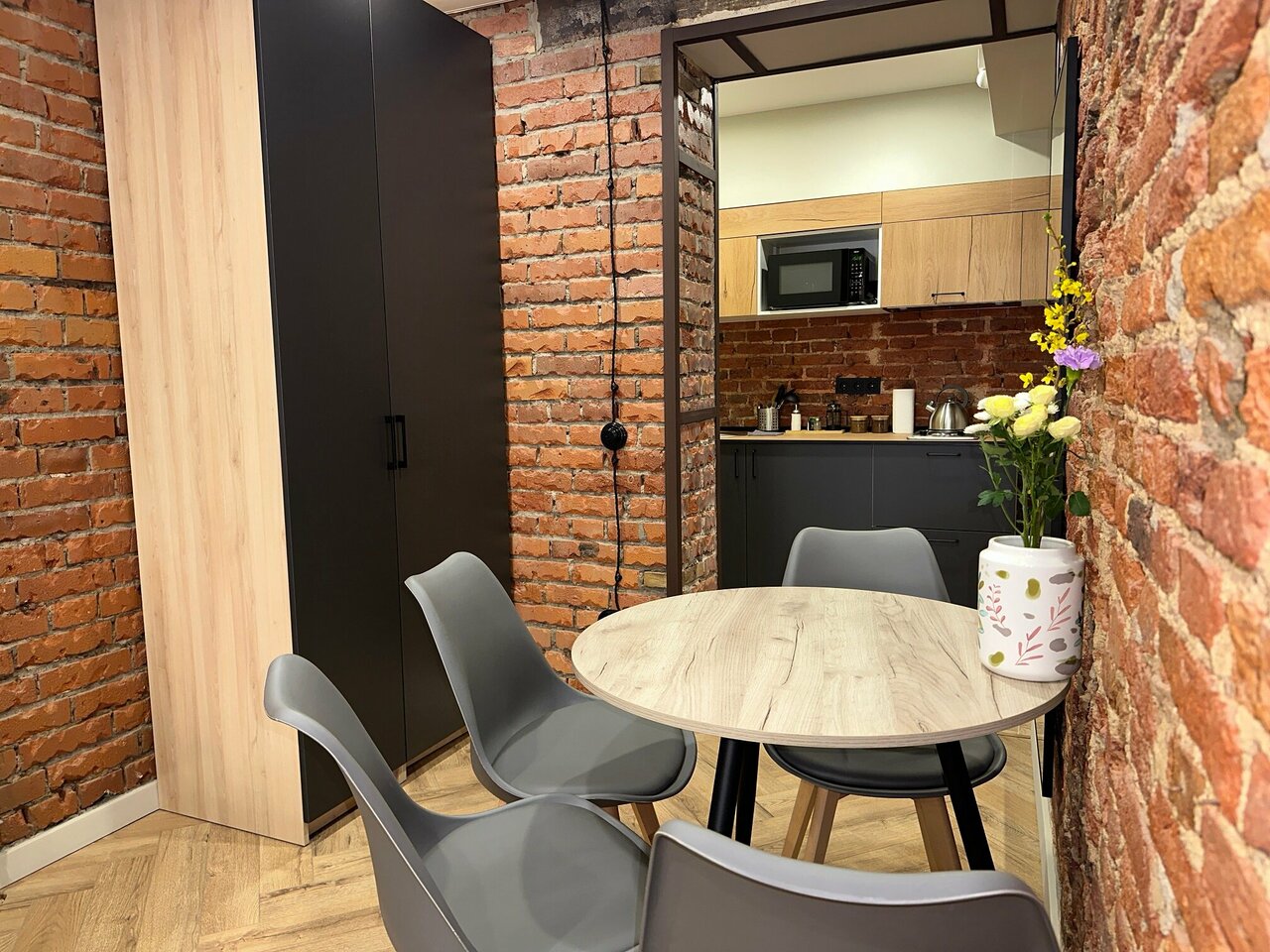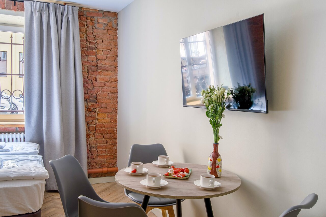 Расположение очень удобное, в центре, всё в шаговой доступности. Есть своя кухня, удобства на высоте. Чистое постельное бельё, свежие полотенца. Очень тихий двор, уютно, отличная шумоизоляция. Обязательно в следующий раз остановимся в этом отеле)