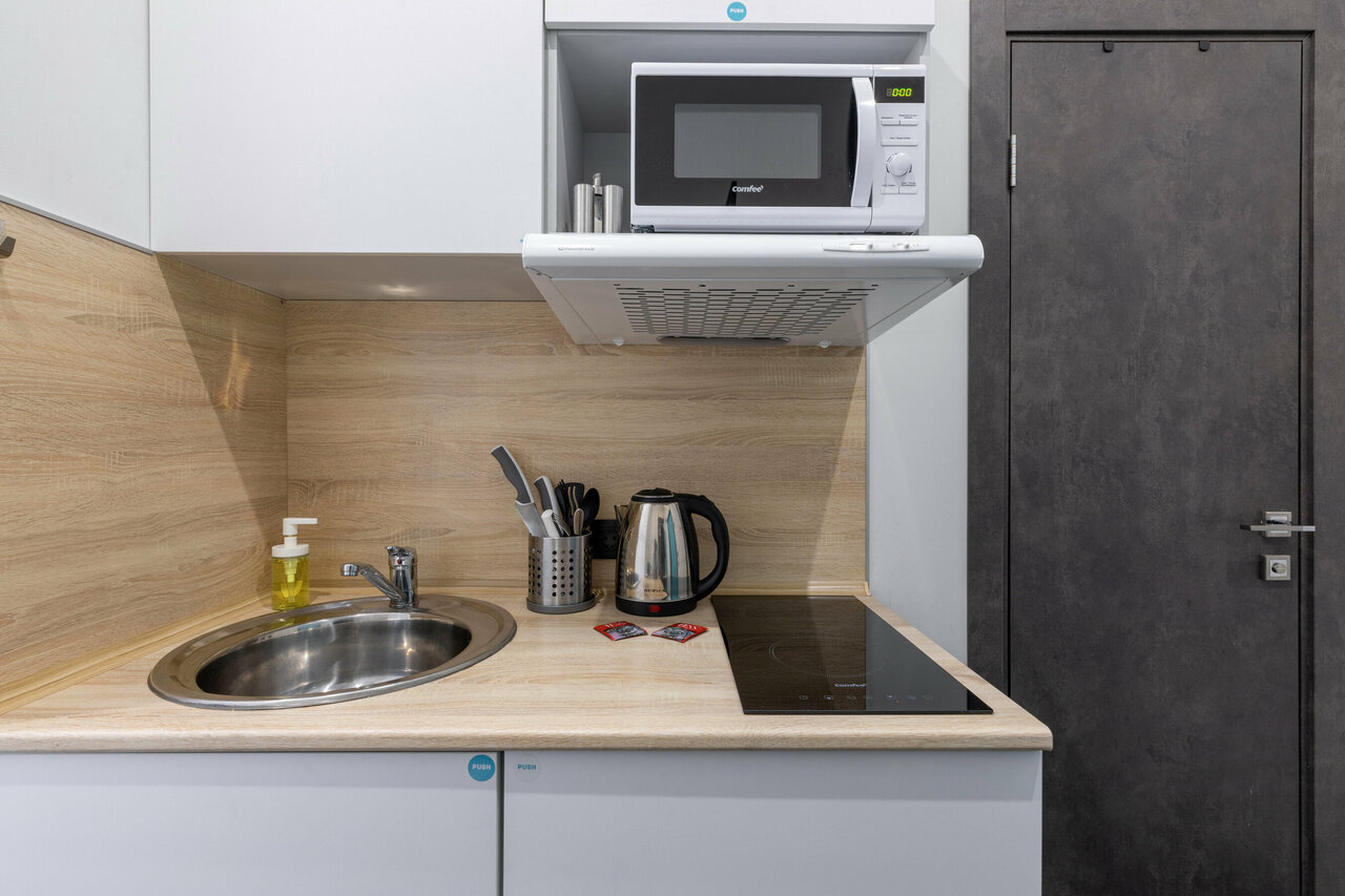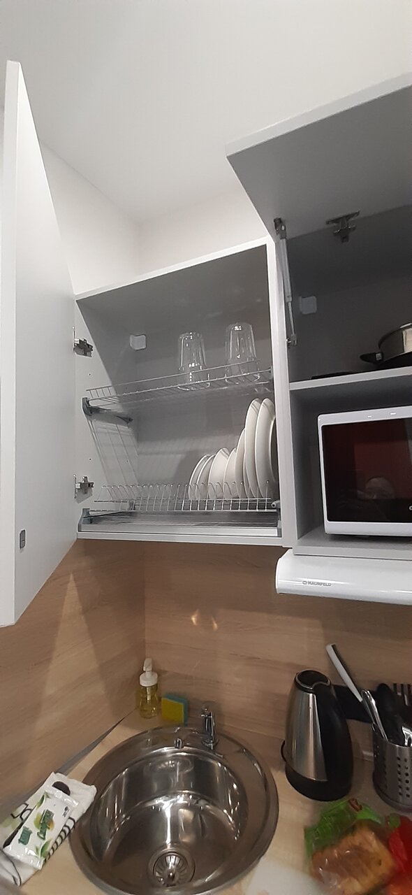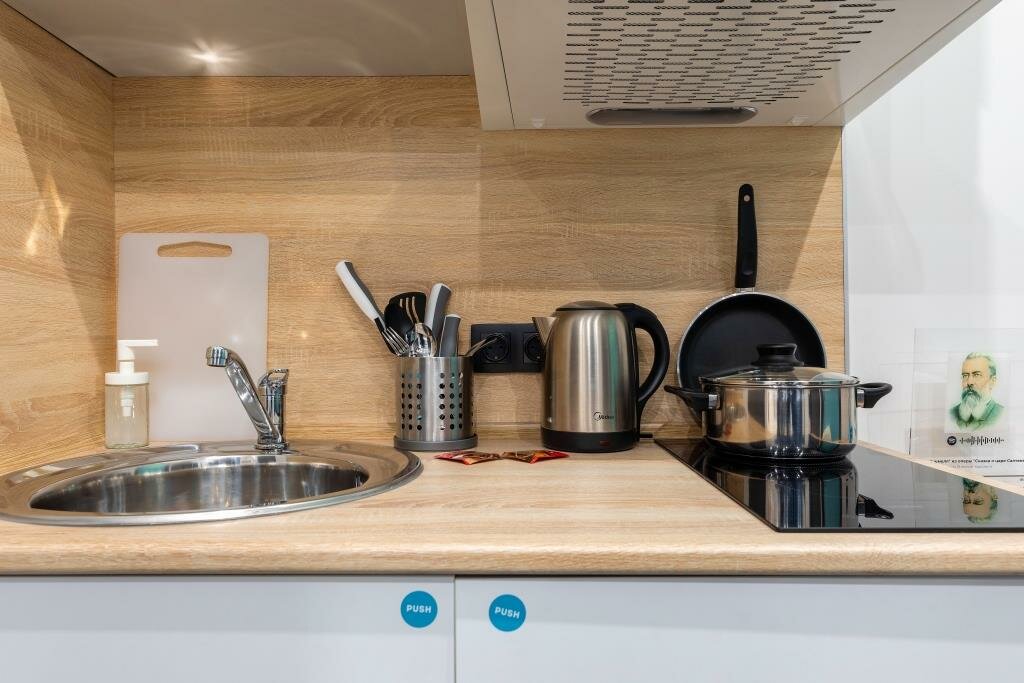 - Наличие кухонного уголка с посудой и чайником.