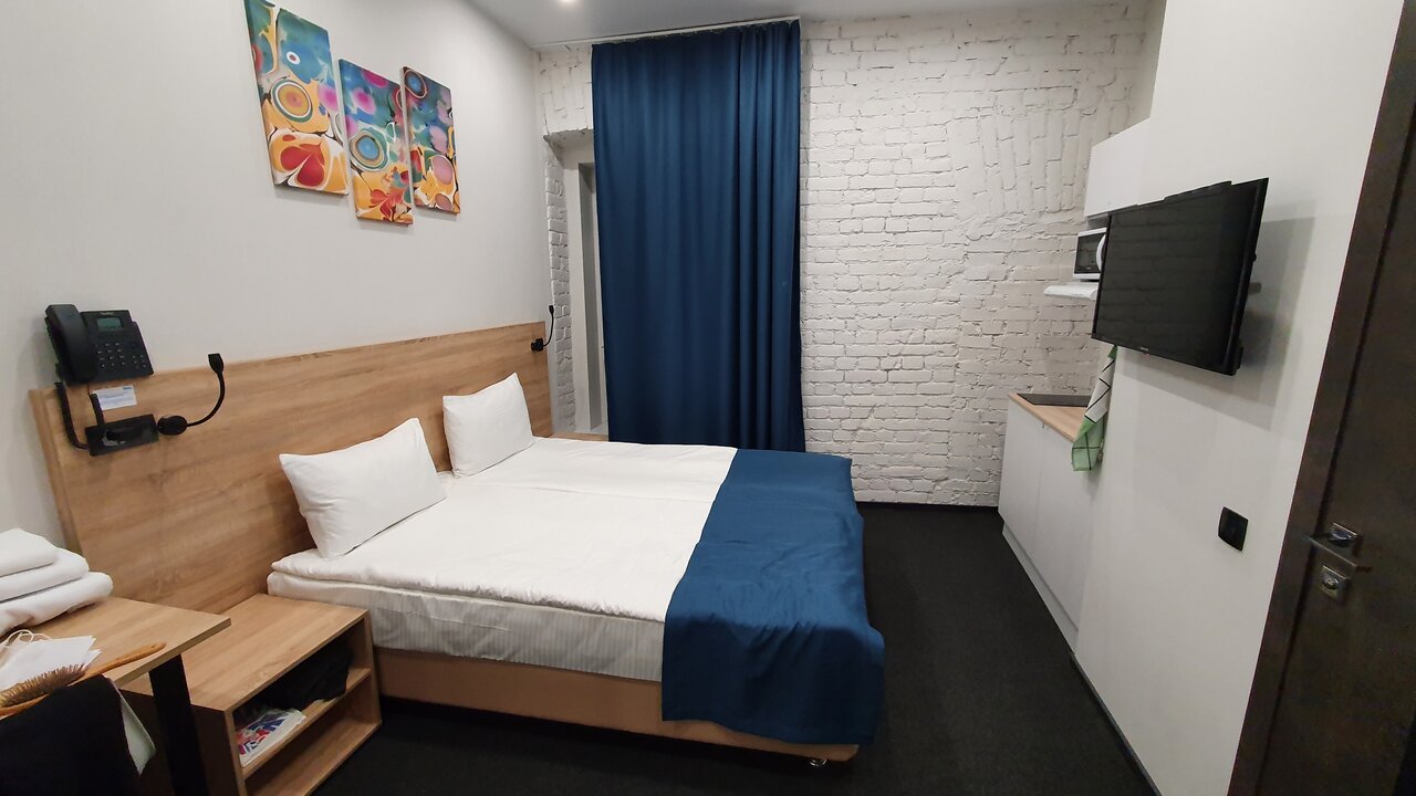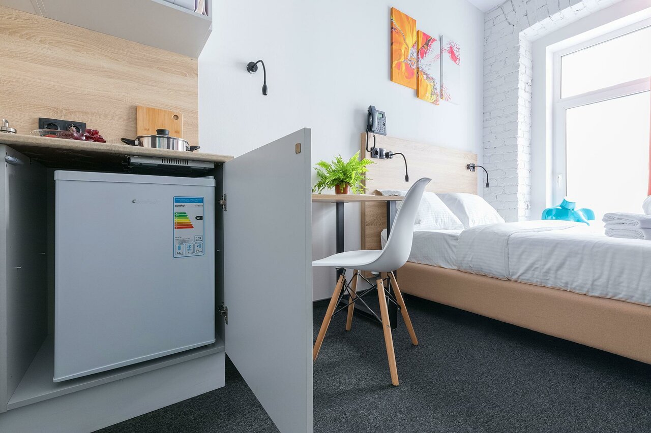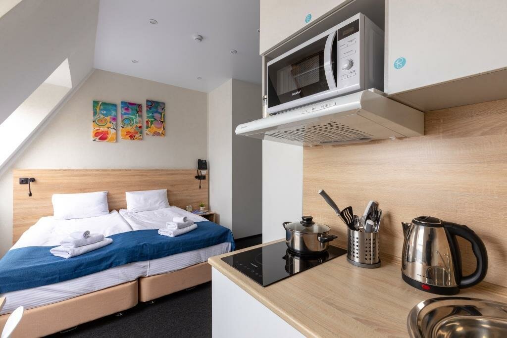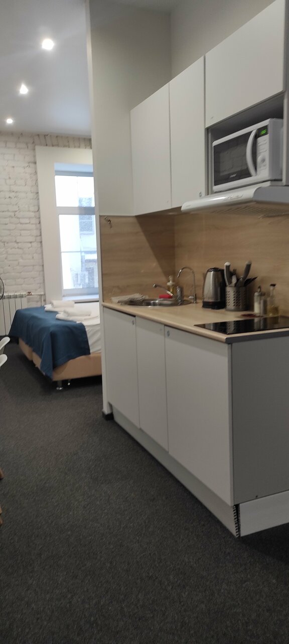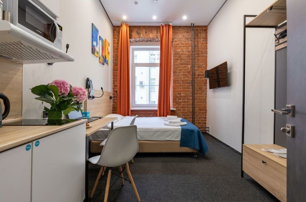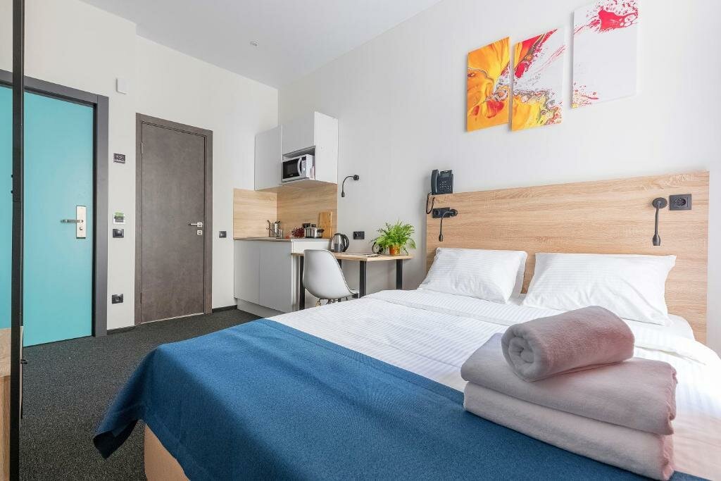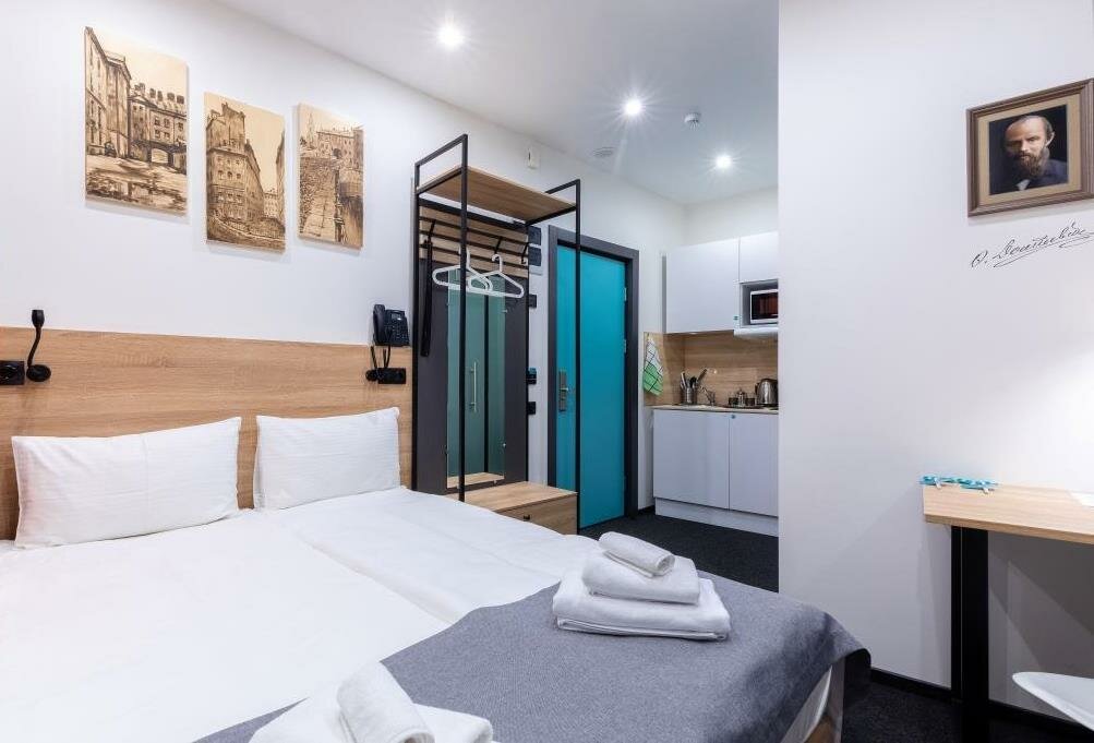 Отличный отель. Очень понравился. Во-первых, он расположен на тихий улице, но при этом рядом с метро. Хорошая звукоизоляция. Уборщицы не начинают греметь в 8 утра, их вообще не слышно, за что им огромное спасибо. При выборе номера надо внимательно выбирать размер номера. В номерах 22 кв м вполне себе просторно, есть все и зубная щетка, и тапочки, и кухня с посудой, губкой, полотенцем, моющими средствами. Также по qr коду можно дополнительно заказать халаты, бокалы, коврик для йоги и много еще всего, даже игры вроде Uno. В номере первый день было холодно, но обогреватель моментально принесли, он быстро согрел номер. Заметно, что персонал отеля старается быть внимательным к гостям, это очень приятно. Рядом с отелем театр Ленсовета, музей Достоевского, до вокзала 15-20 минут пешком. Много разных кафе.