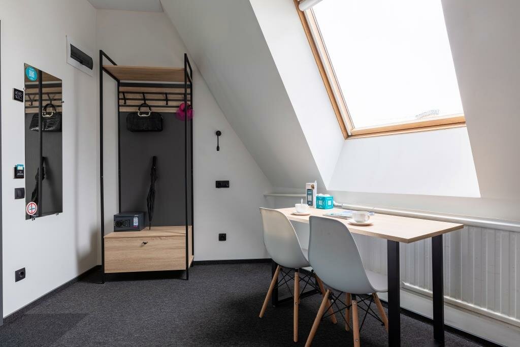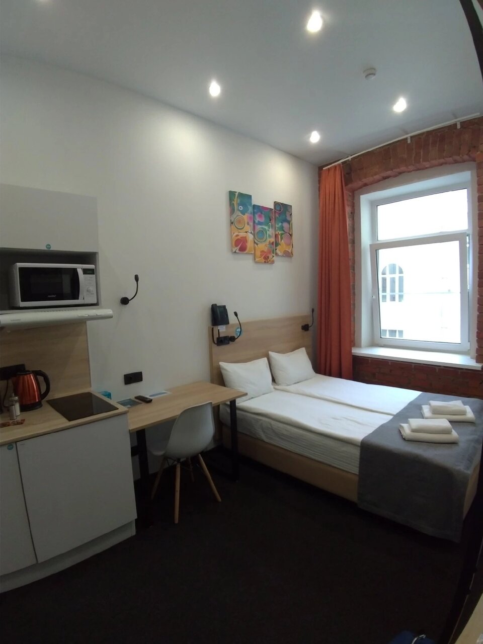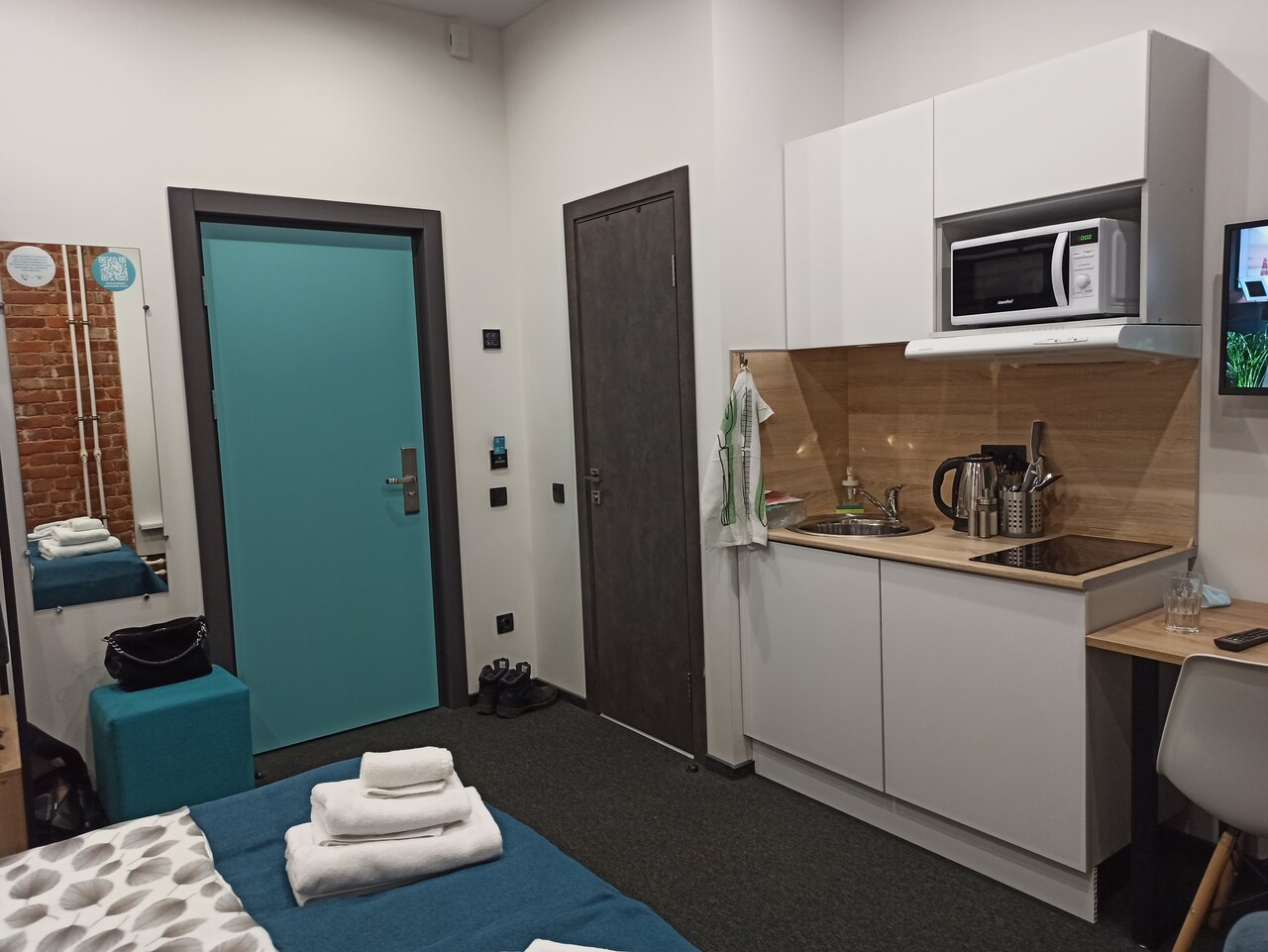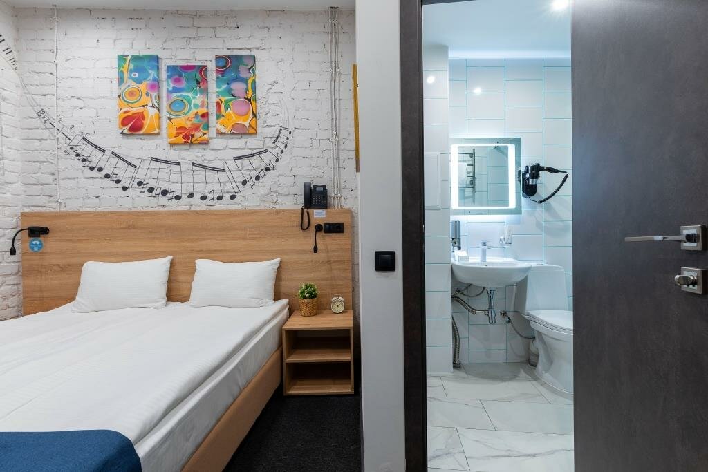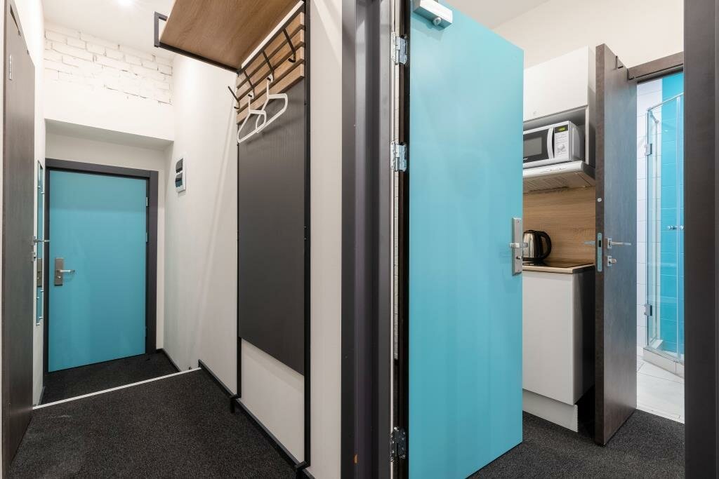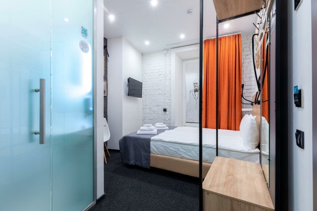 Отличный отель. Очень понравился. Во-первых, он расположен на тихий улице, но при этом рядом с метро. Хорошая звукоизоляция. Уборщицы не начинают греметь в 8 утра, их вообще не слышно, за что им огромное спасибо. При выборе номера надо внимательно выбирать размер номера. В номерах 22 кв м вполне себе просторно, есть все и зубная щетка, и тапочки, и кухня с посудой, губкой, полотенцем, моющими средствами. Также по qr коду можно дополнительно заказать халаты, бокалы, коврик для йоги и много еще всего, даже игры вроде Uno. В номере первый день было холодно, но обогреватель моментально принесли, он быстро согрел номер. Заметно, что персонал отеля старается быть внимательным к гостям, это очень приятно. Рядом с отелем театр Ленсовета, музей Достоевского, до вокзала 15-20 минут пешком. Много разных кафе.