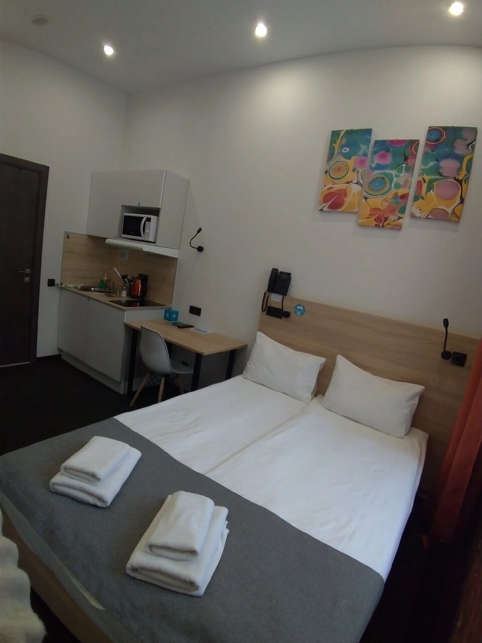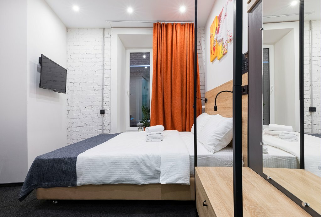Хороший просторный светлый номер; картины, шторы, ремонт, — всё на уровне. Полотенца и бельё свежие, меняют регулярно. В номере есть кухонка, чайник, набор посуды. Прибирают тоже регулярно. Не было никаких проблем ни с заселением, ни с проживанием. Очень довольны.