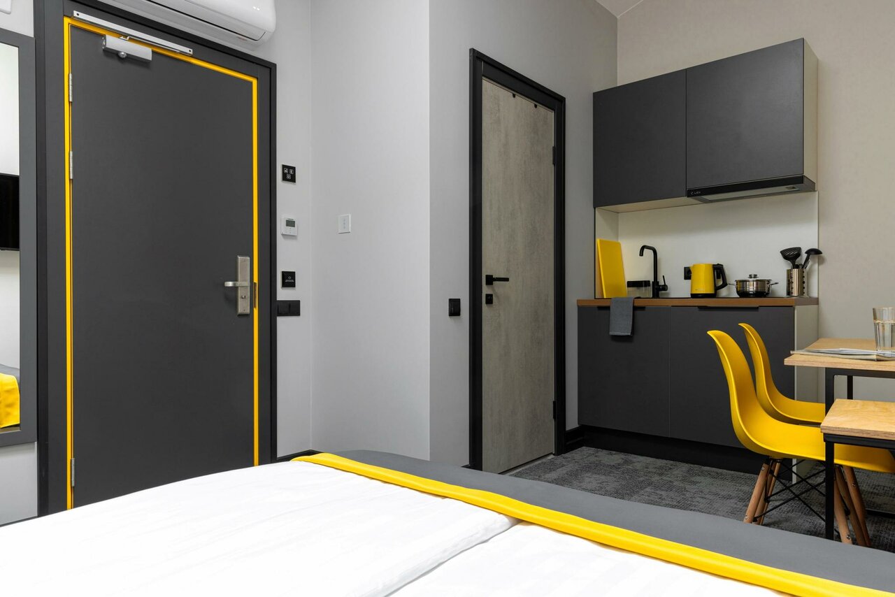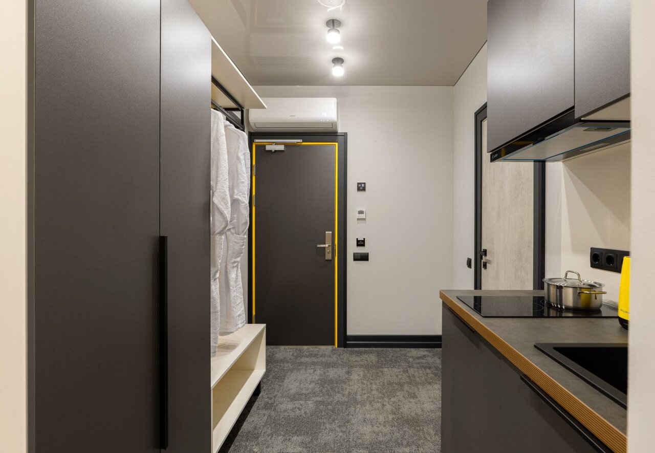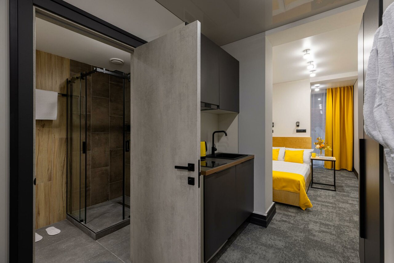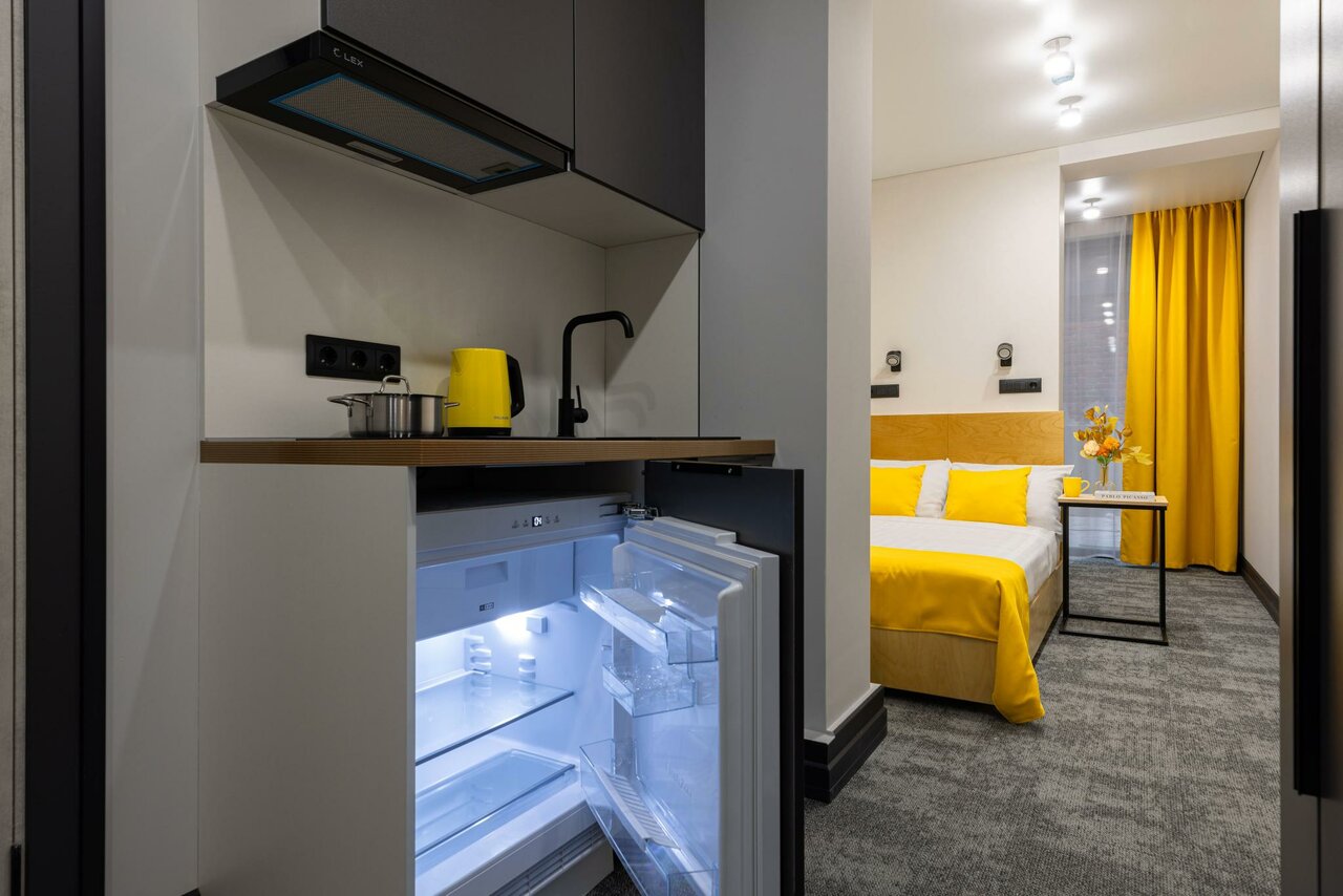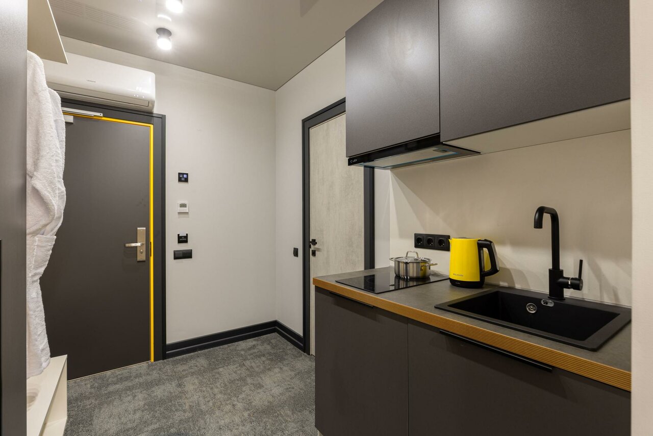 Номер 18-20 м2 с удобной двуспальной или 2 раздельными кроватями и креслом-кроватью. В номере расположены: кухонная зона, холодильник, чайник, микроволновая печь и индукционная плита. Кондиционер в летний период.